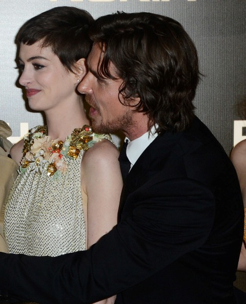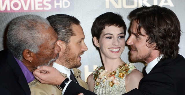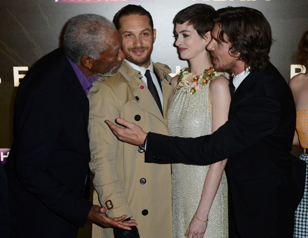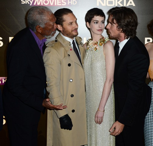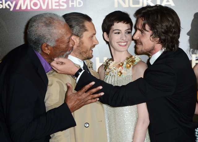 Here they are, the happy cast of The Dark Knight Rises in London last night at the premiere. Look at how close they all are. How at ease and not uncomfortably familiar with each other at all. Are they all heading to Asia or Australia now? Oh, well, that’ll be fun too.