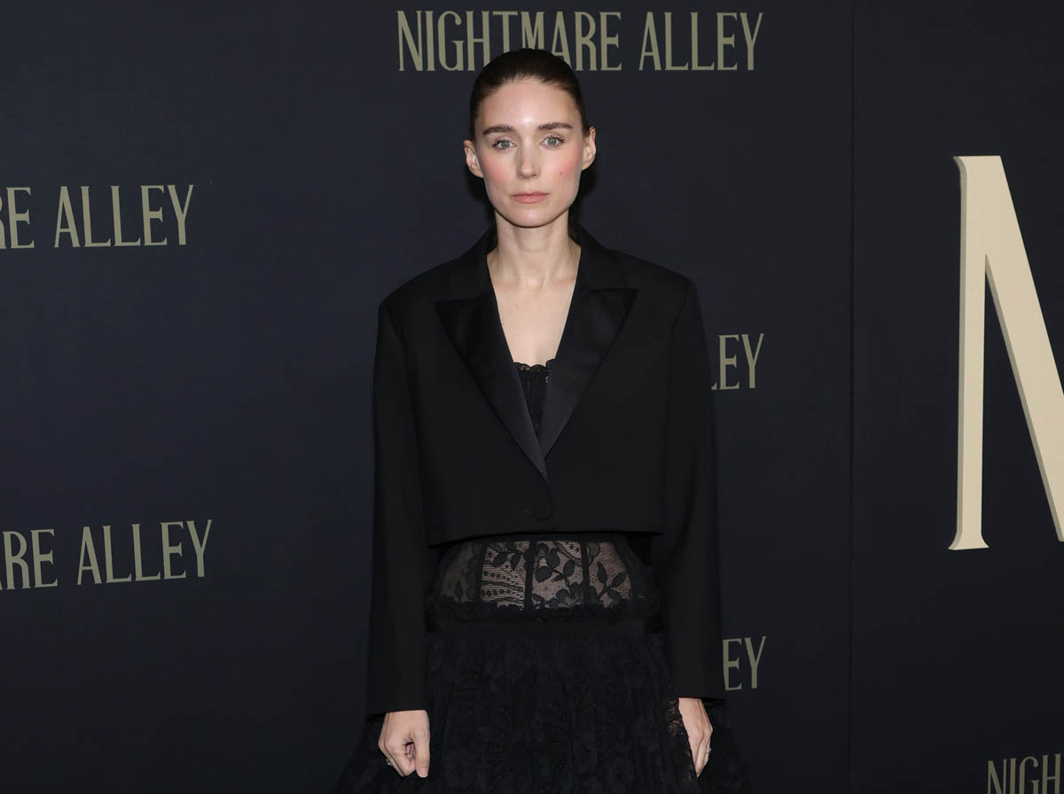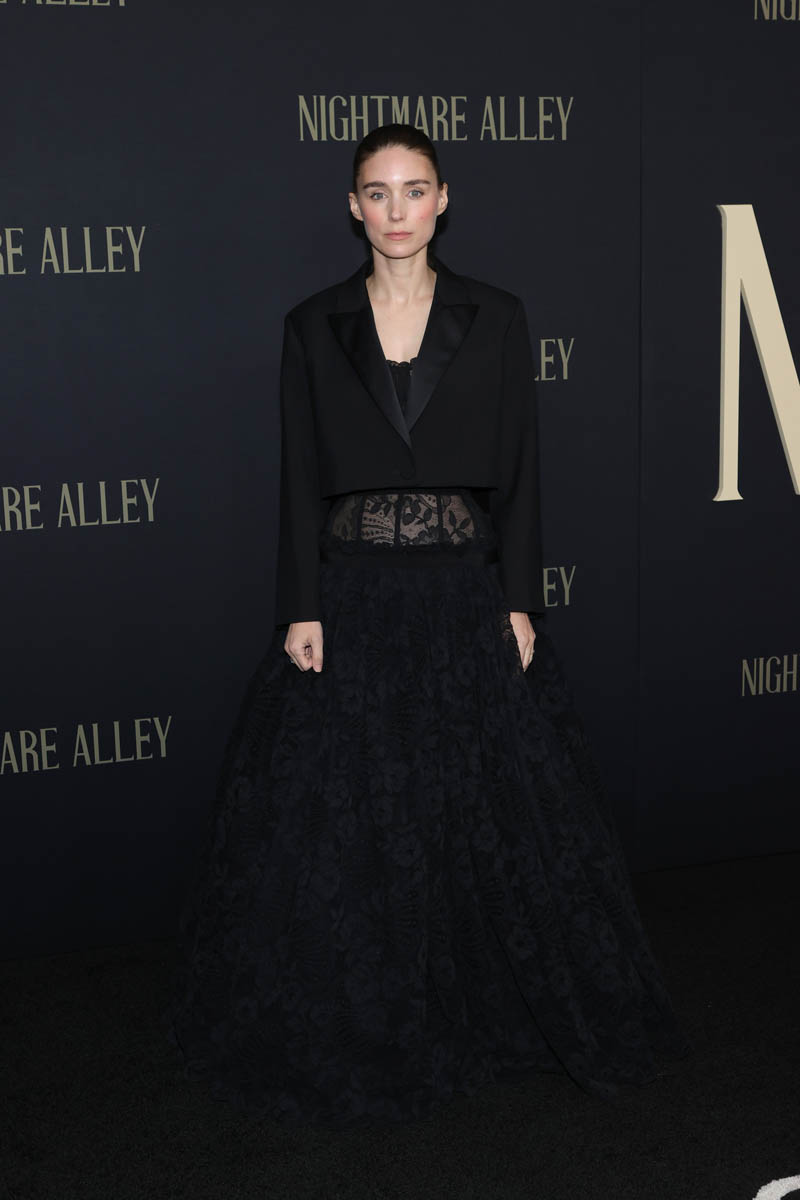 The Fug Girls are right – this is indeed a very Rooney Mara outfit. And it’s great. I love the boxy short jacket exposing the lace in the mid-section going into a drop full skirt, very much the same aesthetic but really well-constructed. It’s Alexander McQueen, which surprises me, not because it doesn’t look like a McQueen but because when I think Rooney, I think Givenchy, that’s her usual fashion house. (Go Fug Yourself)