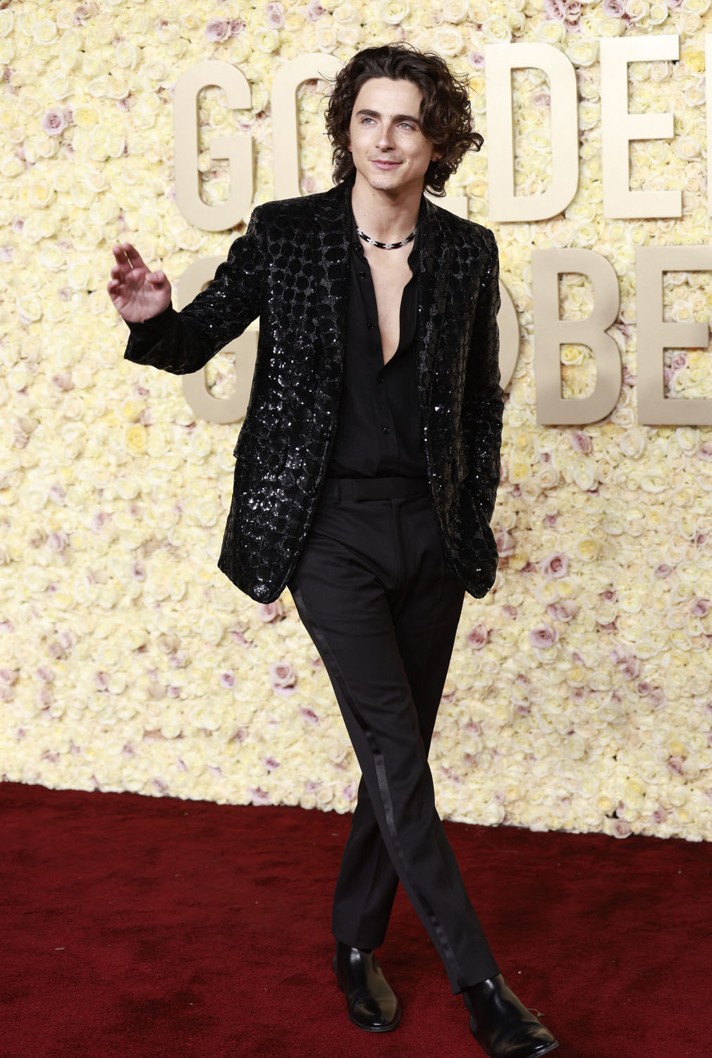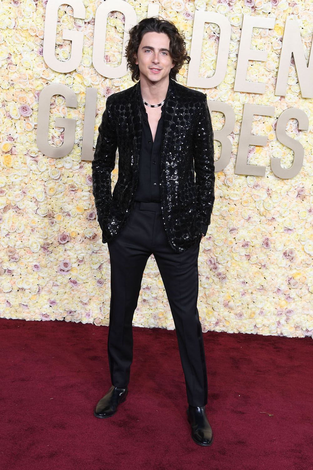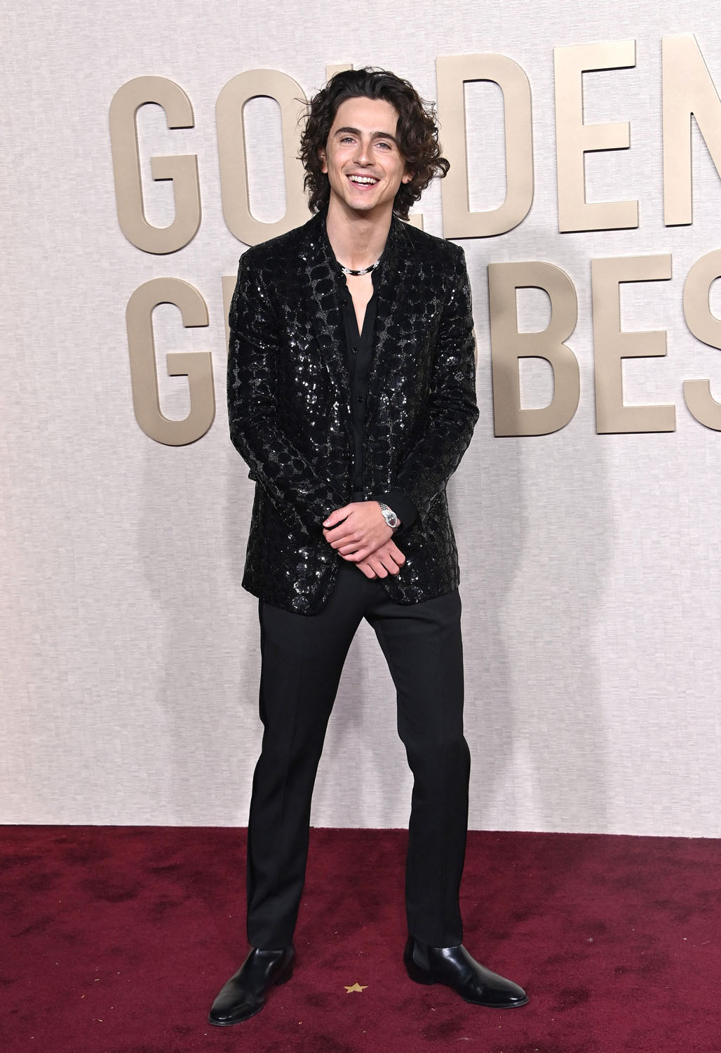 Selena Gomez, like Taylor, is also at the Globes as a nominee. Her look is Armani but, again, nobody is talking about the clothes right now! And rounding out our nominee list is Timothée Chalamet, who wore a relatively muted, by his standards, sparkly blazer over tuxedo pants and walked the carpet on his own.