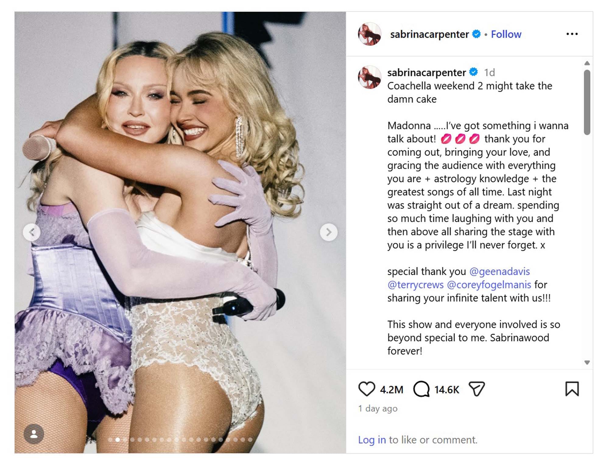 One thing that fans online are pointing out, though, is how dead the crowd was, especially for a moment as legendary as this. Coachella is something of the influencer Olympics at this point and generally the people that are having a good time aren’t on their phones. I did get a good chuckle out of some posts though calling out the audience reactions versus the viewers at home. Even Addison Rae made a comment on stage about the Coachella crowd. Don’t worry Addison, if not even Sabrina and Madonna can wake that crowd up then it had nothing to do with you in the first place.