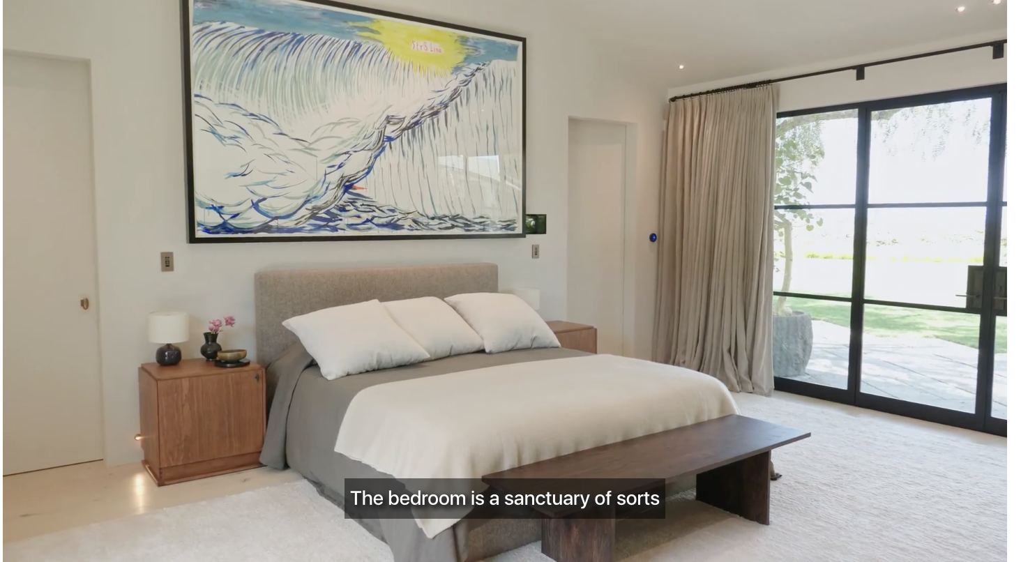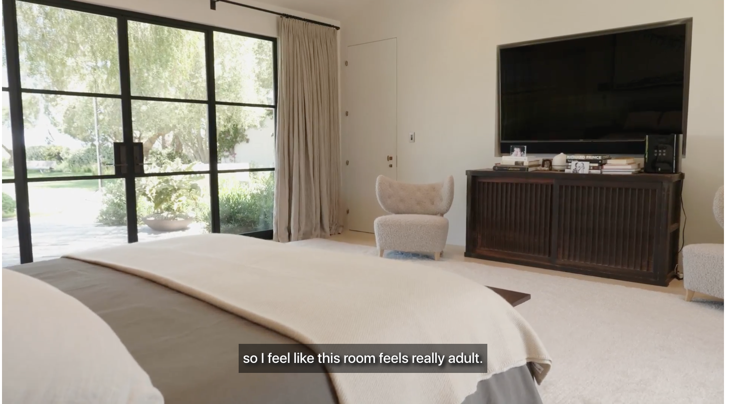 What? Why? They have the space for a king bed (and have two kids and two dogs who you know are in there all the time). Why would they willingly squeeze into a queen? As Niki noted, it could be a guest room, but then why is it attached to the walk-in closets and master bath? They also make a point to say they spend a lot of time in their bedroom and it’s a sanctuary. Here are two screenshots – I can’t really tell if it’s a king or queen by looking at it because the painting above the bed is so big.