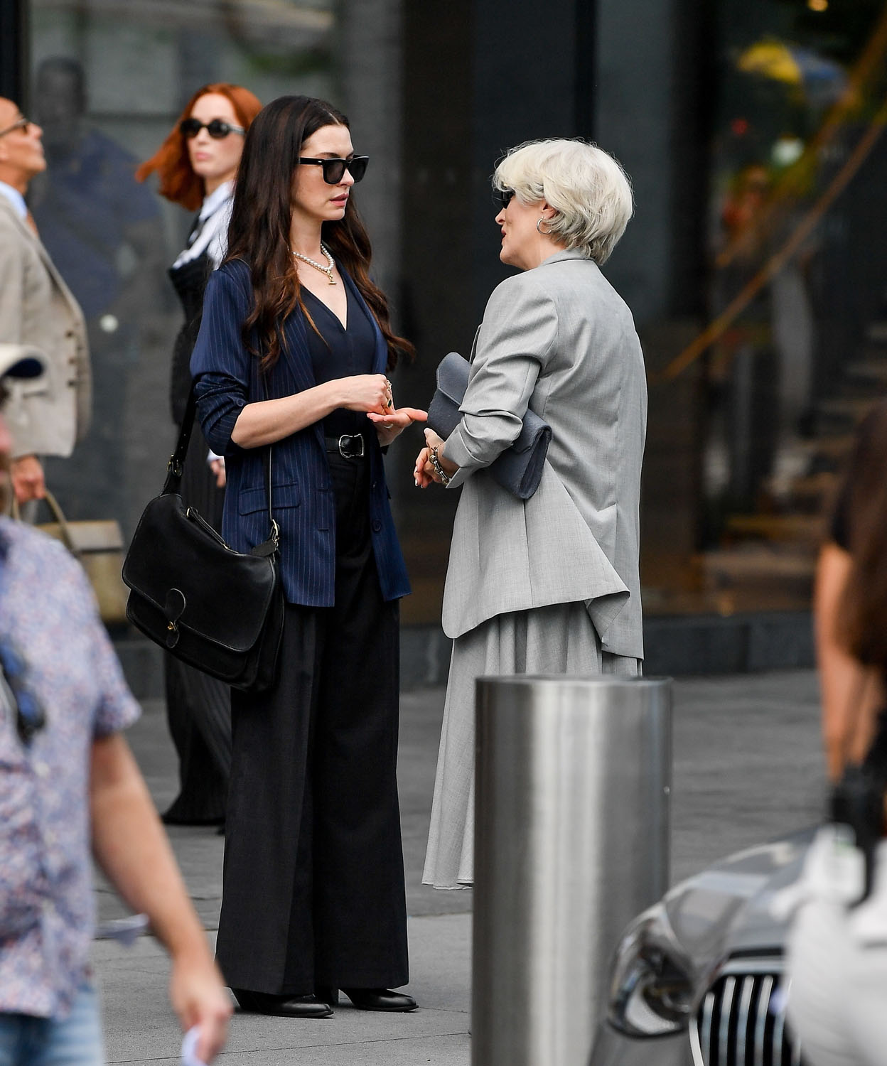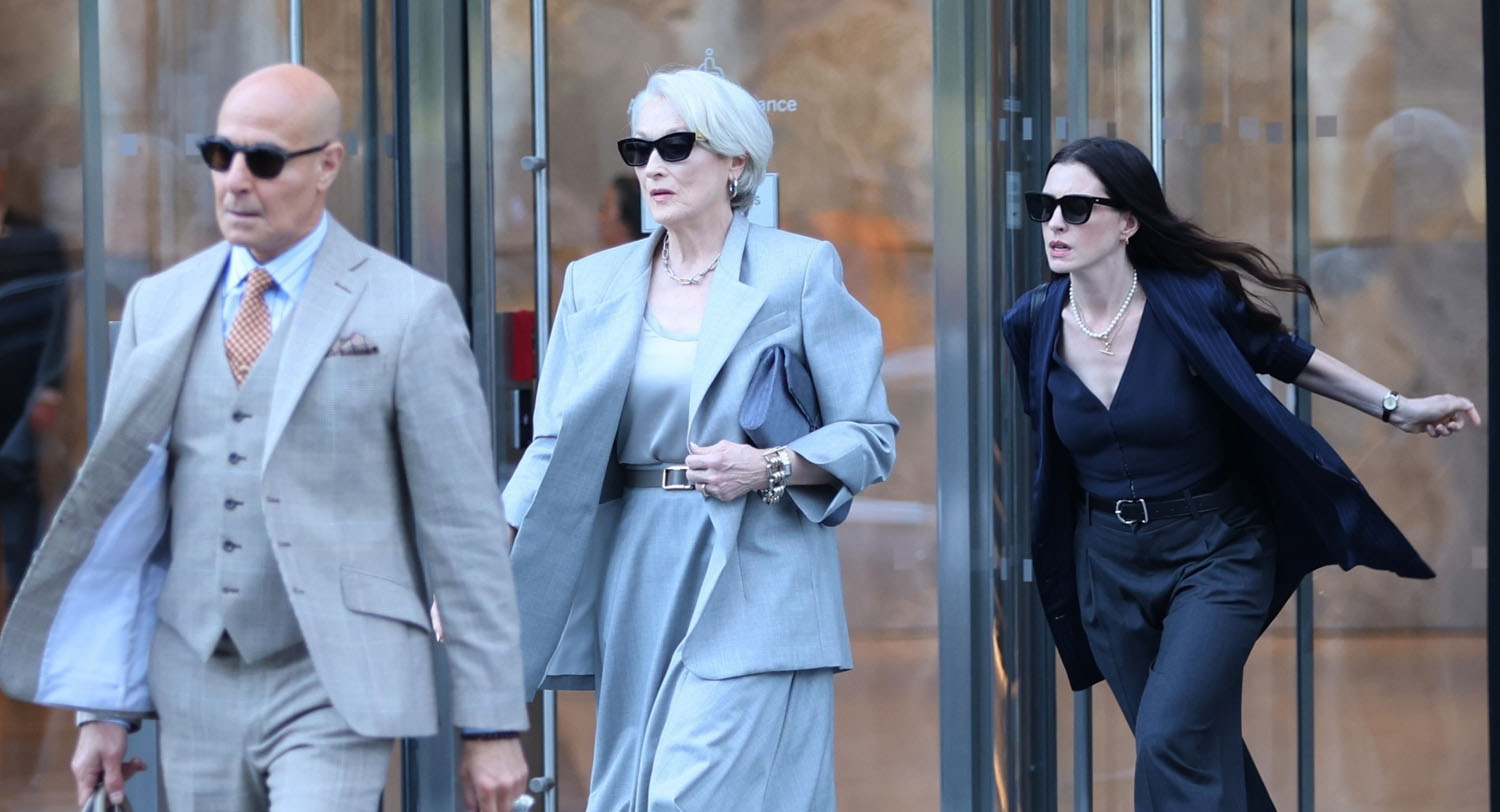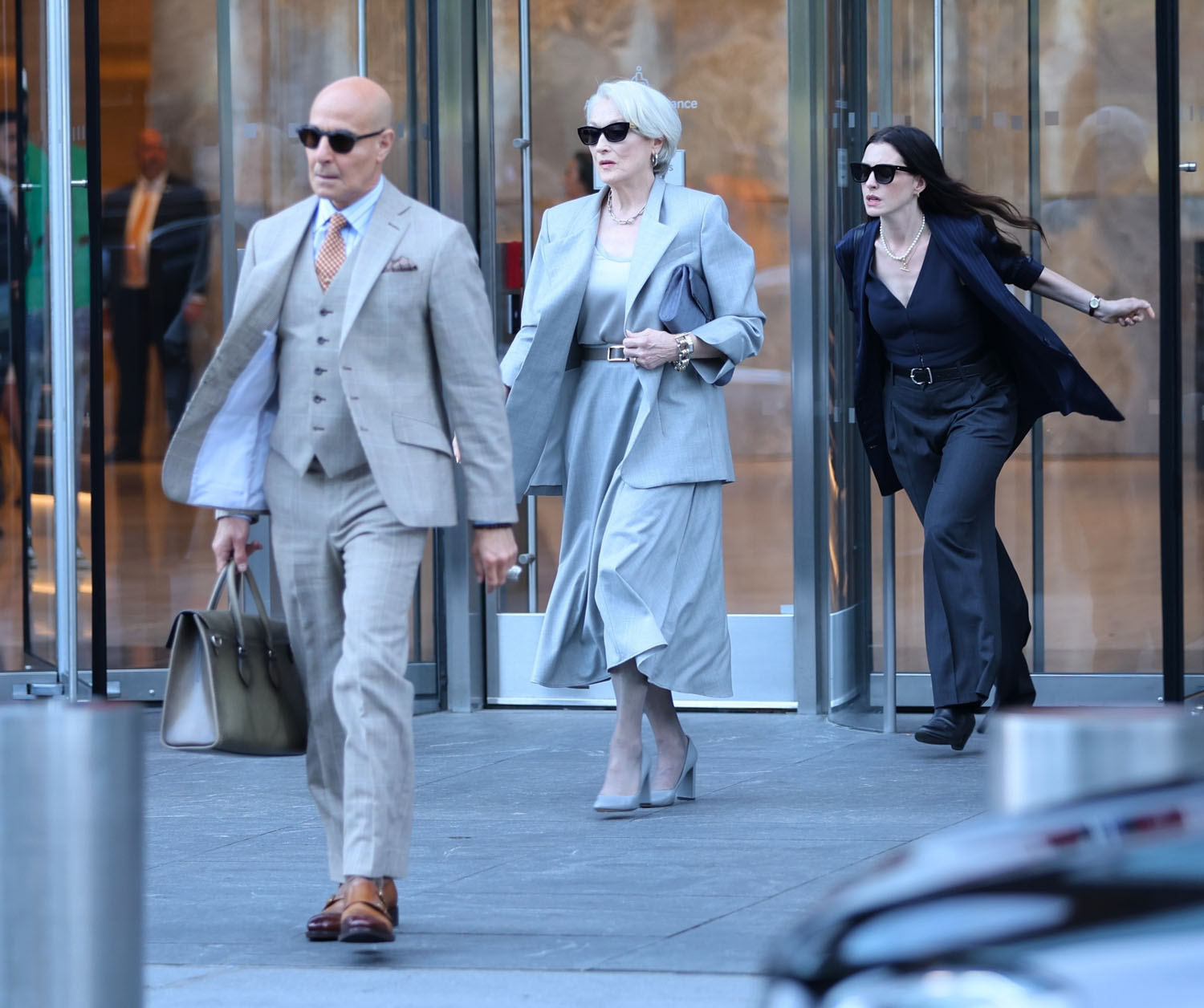 Every day lately we’ve been getting photos from the set of The Devil Wears Prada 2 but these photos from this morning feature the Prada four – the core four actors we associate most with the movie, right? That would be Anne Hathaway, Meryl Streep, Stanley Tucci, and Emily Blunt.