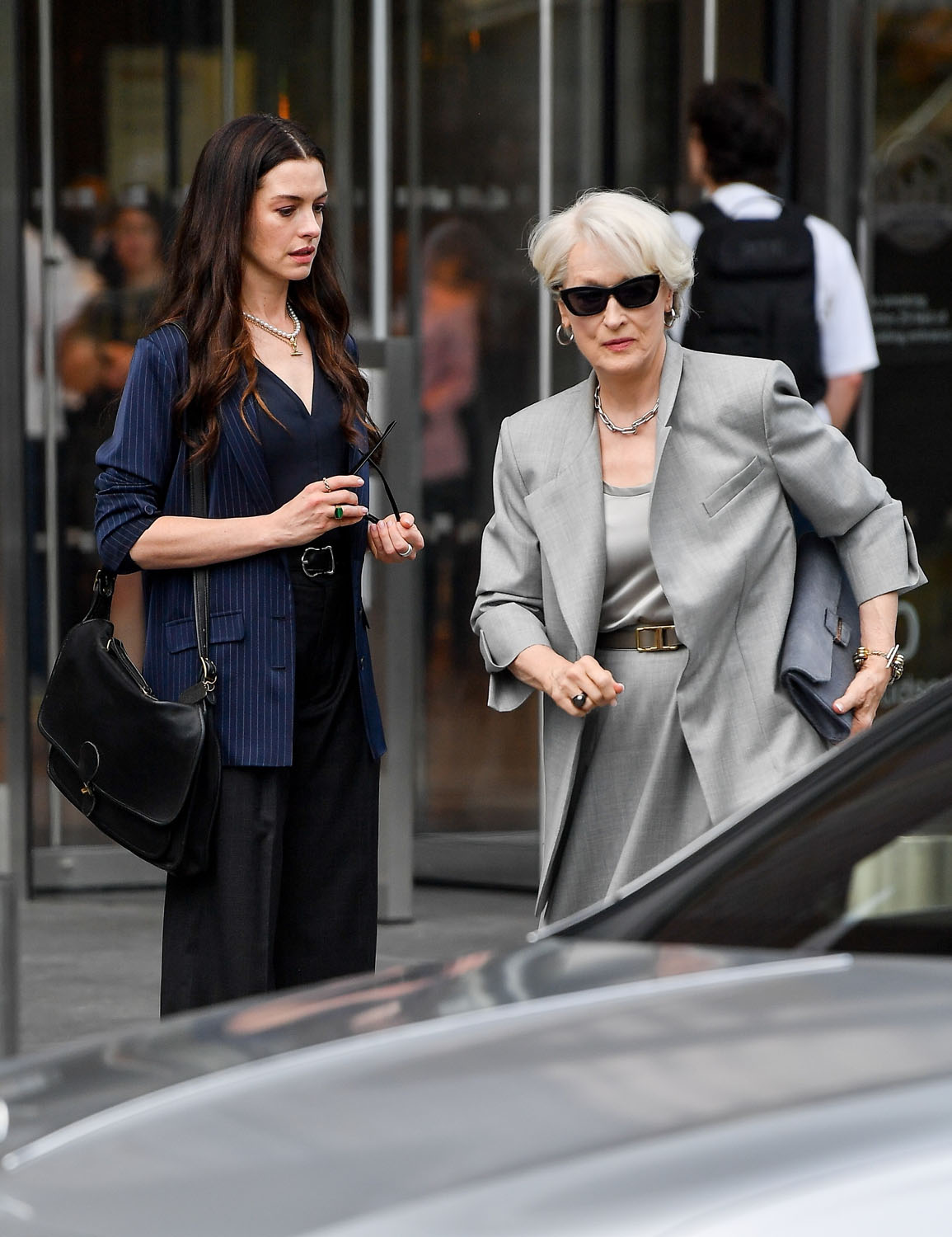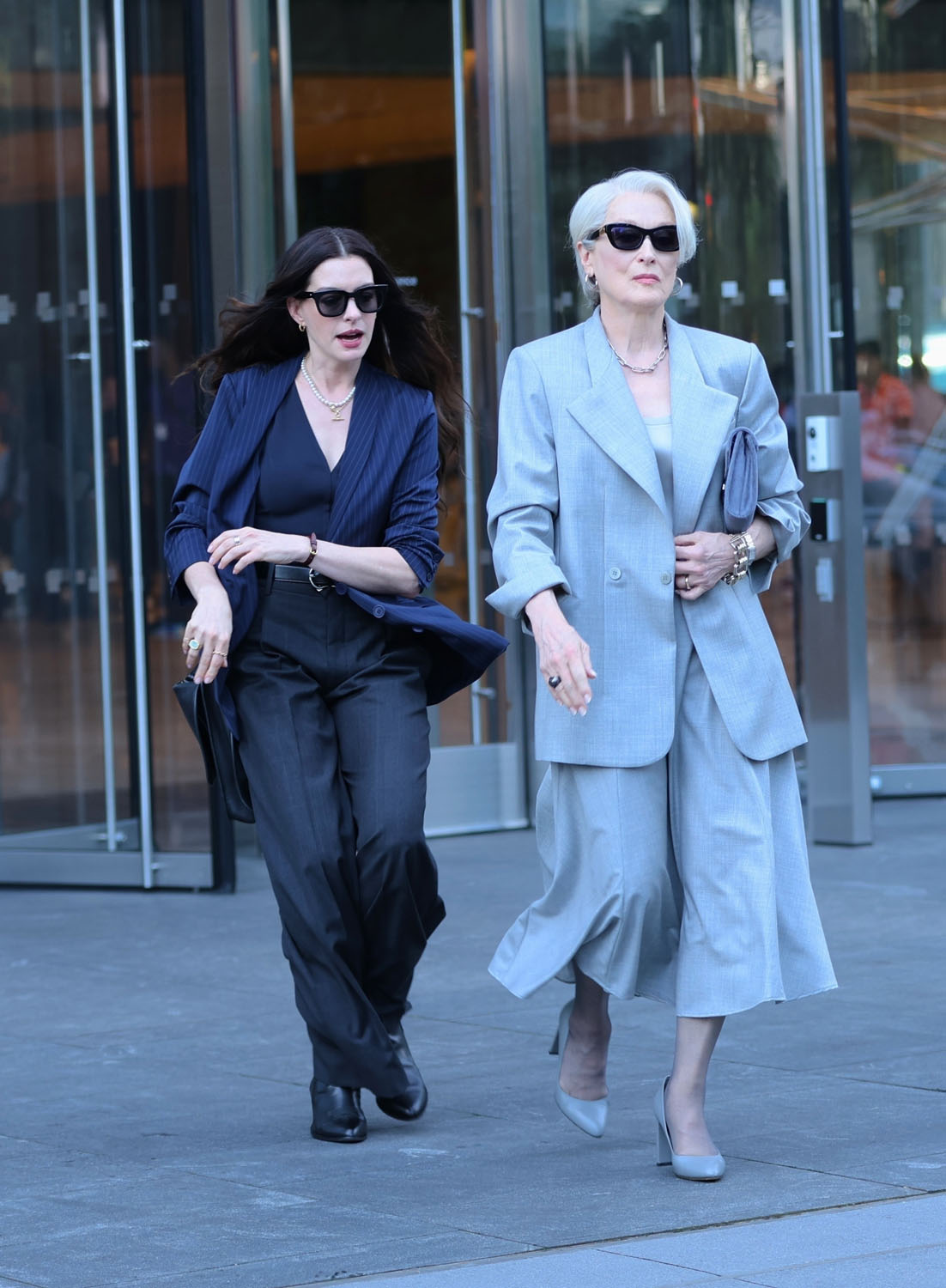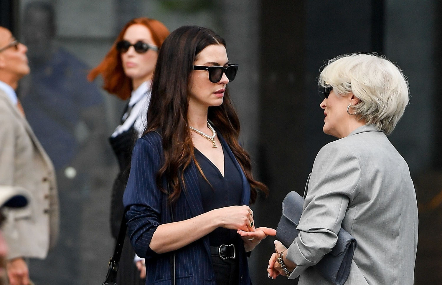 Every day lately we’ve been getting photos from the set of The Devil Wears Prada 2 but these photos from this morning feature the Prada four – the core four actors we associate most with the movie, right? That would be Anne Hathaway, Meryl Streep, Stanley Tucci, and Emily Blunt.