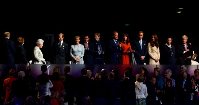 The Queen was in attendance tonight. As were the Cambridges, William and Catherine, who were seated quite a distance from their grandmother. The position of honour went to her youngest son Prince Edward and his wife Sophie who, by succession at least, were certainly not the most senior royals present. According to succession protocol, as you know, Will ranks higher than his uncle. Remember on June 5, on Diamond Jubilee Day, the Queen appeared on the balcony at Buckingham Palace with only Charles and his family - click here for a refresher. This however was not a proper royal occasion; the Queen is merely (I felt bad writing this word so close to hers) a guest at this show and not the subject, so I suppose who sits beside her and why doesn’t carry much significance. I’m just curious about how these things are decided and when. Is it something Her Majesty thinks about at dinner? And is it a formal announcement when she’s made up her mind? Do they send a telegram over to Edward’s to alert him that he’s been ordered to sit beside his mother? And, even though it’s unlikely, would Will and Kate have been closer to the Queen if Harry wasn’t photographed in Vegas cupping his balls? Now you know why there was no way Harry was coming tonight. Grandmother does not want to be associated with him right now.
