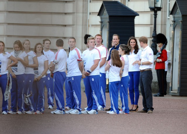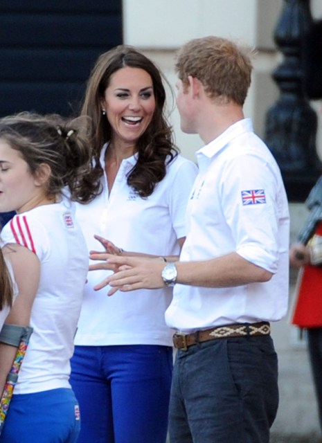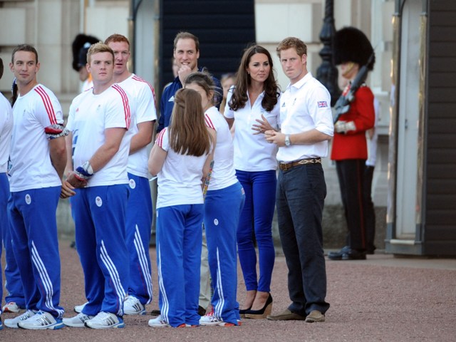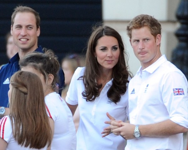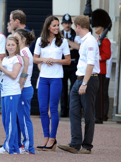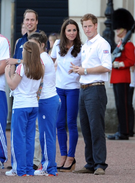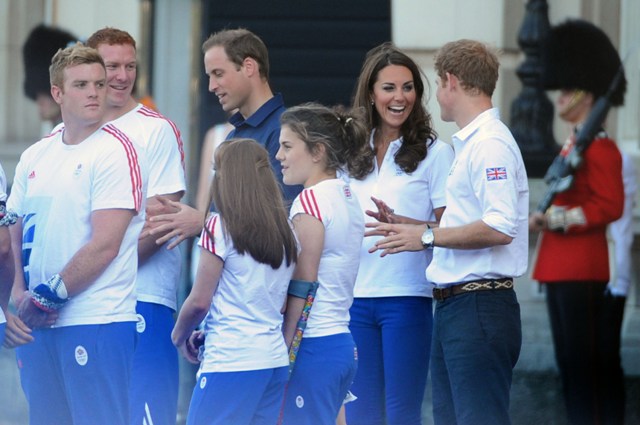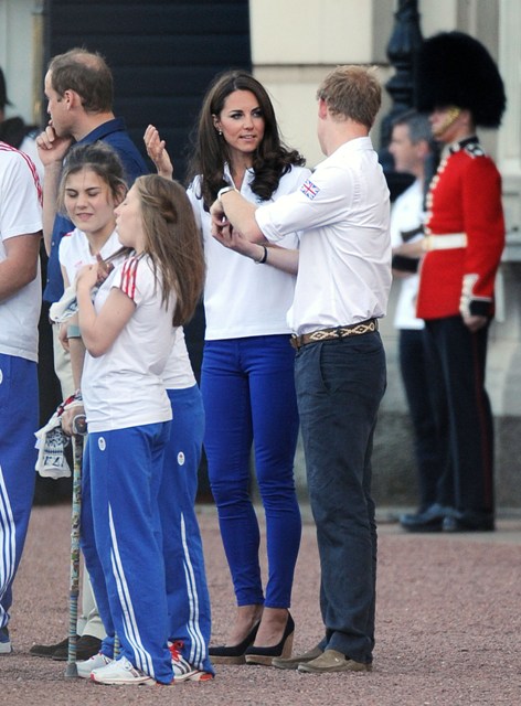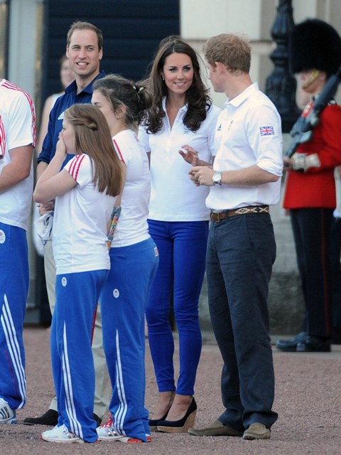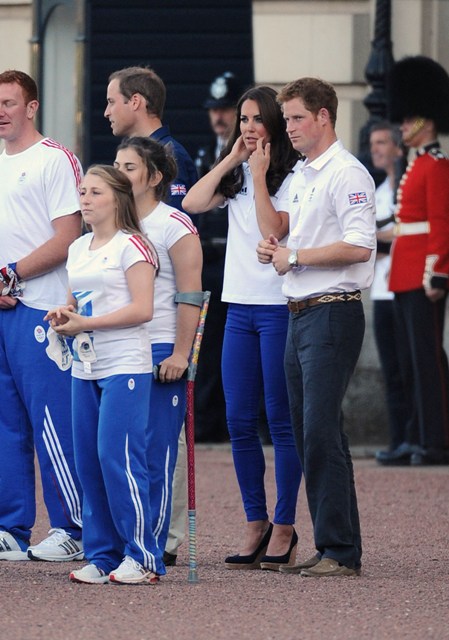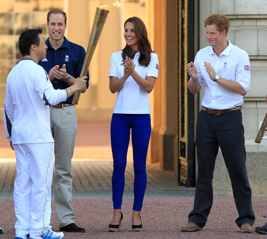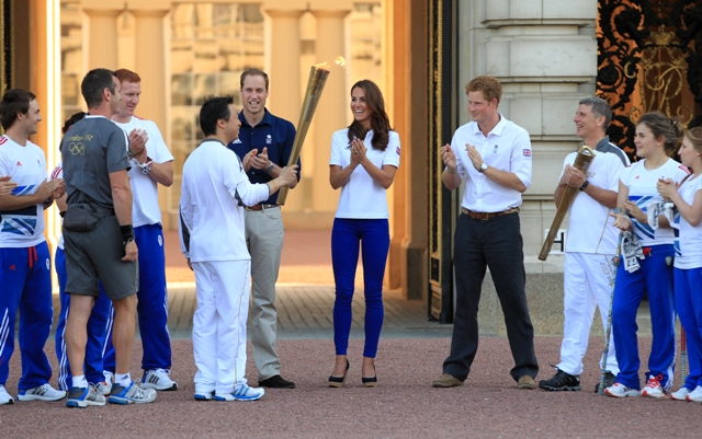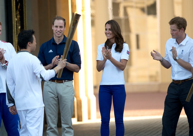 The Olympic torched passed by Buckingham Palace today. Prince William, Catherine, and Prince Harry were there to greet it. They'd each appointed representatives from their charities to be torchbearers.