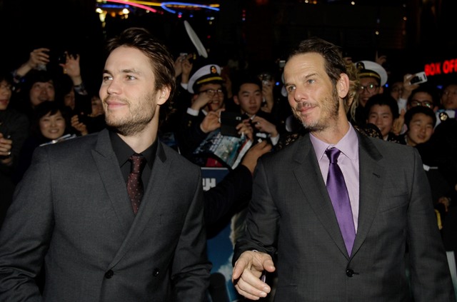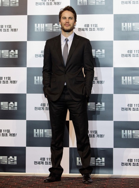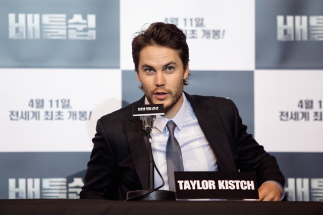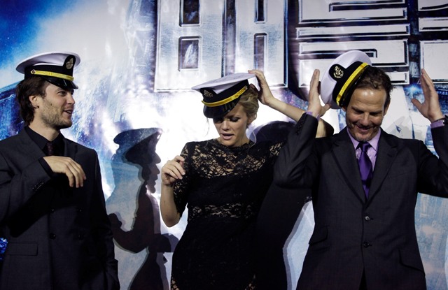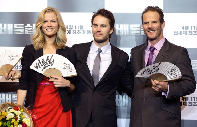 Attached - Taylor Kitsch with Brooklyn Decker and Peter Berg promoting Battleship in South Korea today.