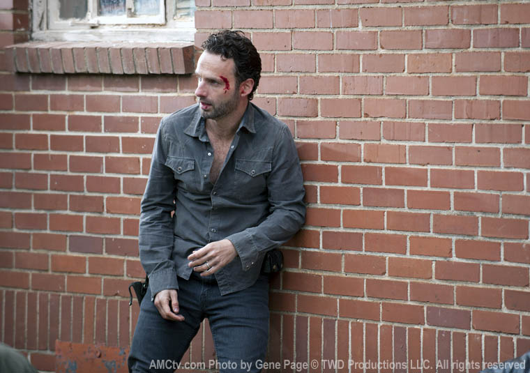 Rick proves his alpha status by tempting a zombie with his own blood and killing it with his knife.