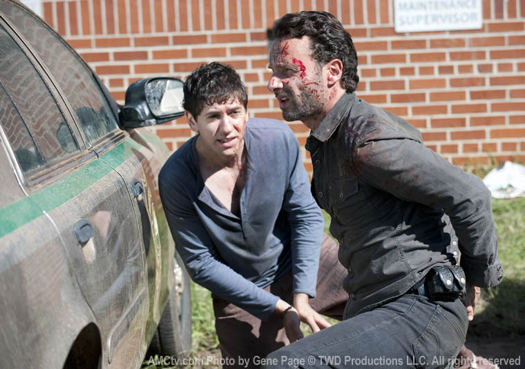 Finally, some action. Rick and Stupid Shane throwing down over whether or not to keep the kid alive until Rick can decide what to do with him. Stupid Shane throws a big-ass wrench at Rick. Which, of course, wakes up a zombie. Oh I see—the scene from the beginning was “now” and everything after was “earlier that day”.