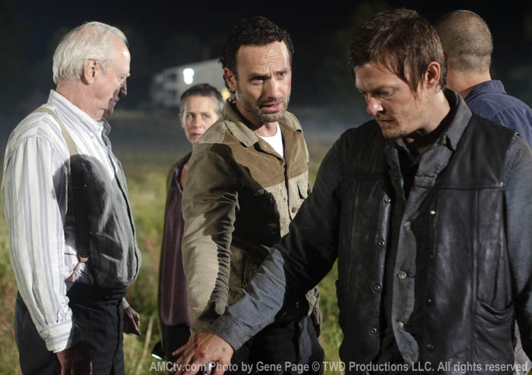 Daryl is in charge of torturing Randall. Poor Randall. He probably wishes Rick left him to the zombies at this point. Randall says there are 30 men in the group he came from, heavily armed. He alludes to the group assaulting a survivor’s teenage daughters. This hits Daryl really, really hard. Combined with how diligently he pursued Sophia, and how hard he took her zombification/death, I wonder if there’s some backstory there. This is a fairly tough scene but the show is always better when it goes dark.
