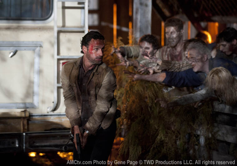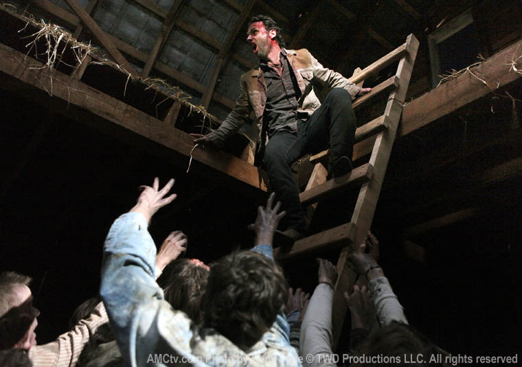 Rick saves Hershel at the most artistic moment. Hershel doesn’t want to abandon his farm, but it’s finally been overrun by zombies. Rick also leaves Andrea and Carol behind (inadvertently). Daryl hears Carol screaming and saves her. Andrea appears to still be on the farm. Sucks to be her.