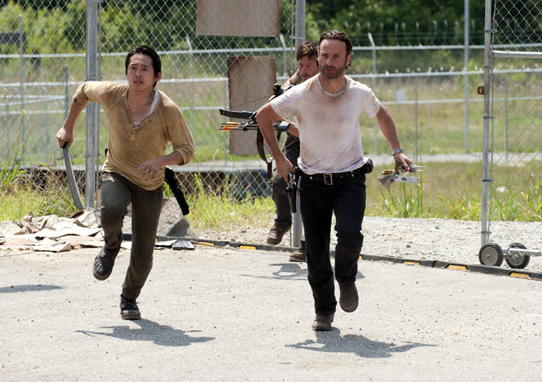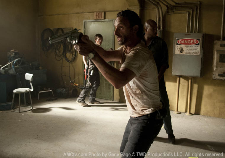 Rick, Daryl and Glenn are cut off by fenced-in yard while all the others are trapped with the zombies that have (probably) been let into their compound. Oh no, T-Dog! He’s bitten and the group is totally under siege.