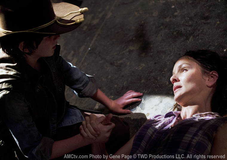 Lori says her goodbyes to Carl as Maggie nuts up (ovaries up?) to do the C-section. Lori basically delivers Ponyboy’s “stay golden” speech. I get that this is supposed to be moving but I’m not feeling it. Maybe because I’ve known this was coming, or because Lori was such an unlikeable character, or because Lori’s death in the comics is a hundred times worse than an emergency C-section, this is not hitting the mark with me.