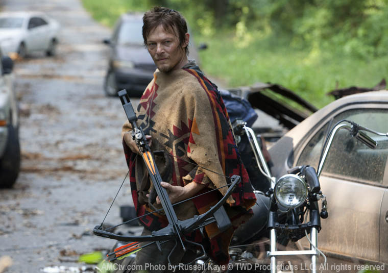 I love Daryl’s poncho! He and Maggie raid a daycare for supplies. There’s a tense moment but it’s just a possum. Or dinner, as Daryl says.