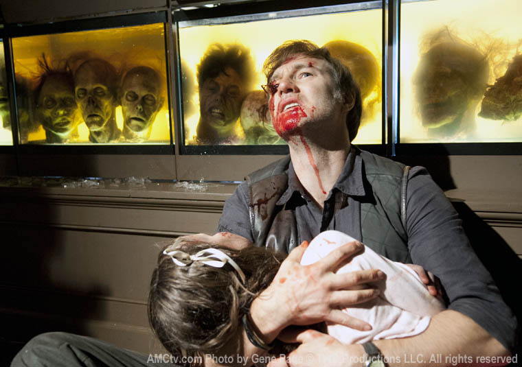 So the Governor keeps his zombie daughter, Penny, in a caged-off wall vent or something. He plays her music and sings to her. This is so creepy on so many levels. I’m also wondering how he has not been bitten/scratched by now.