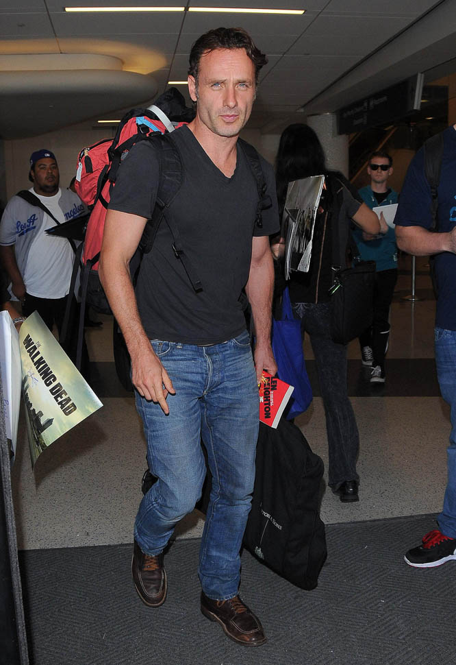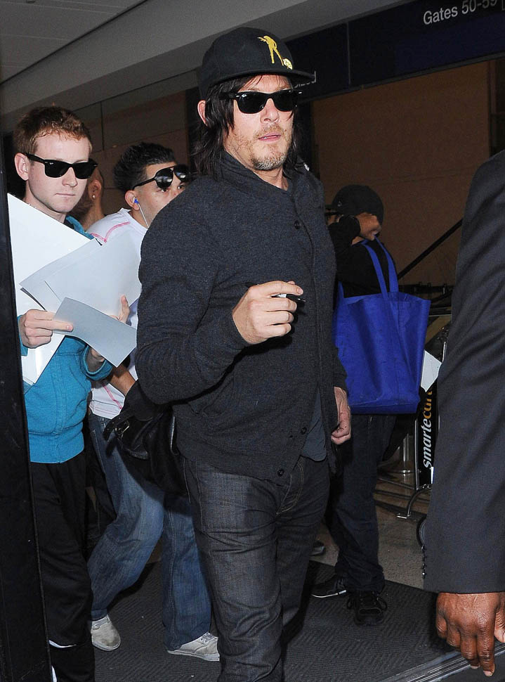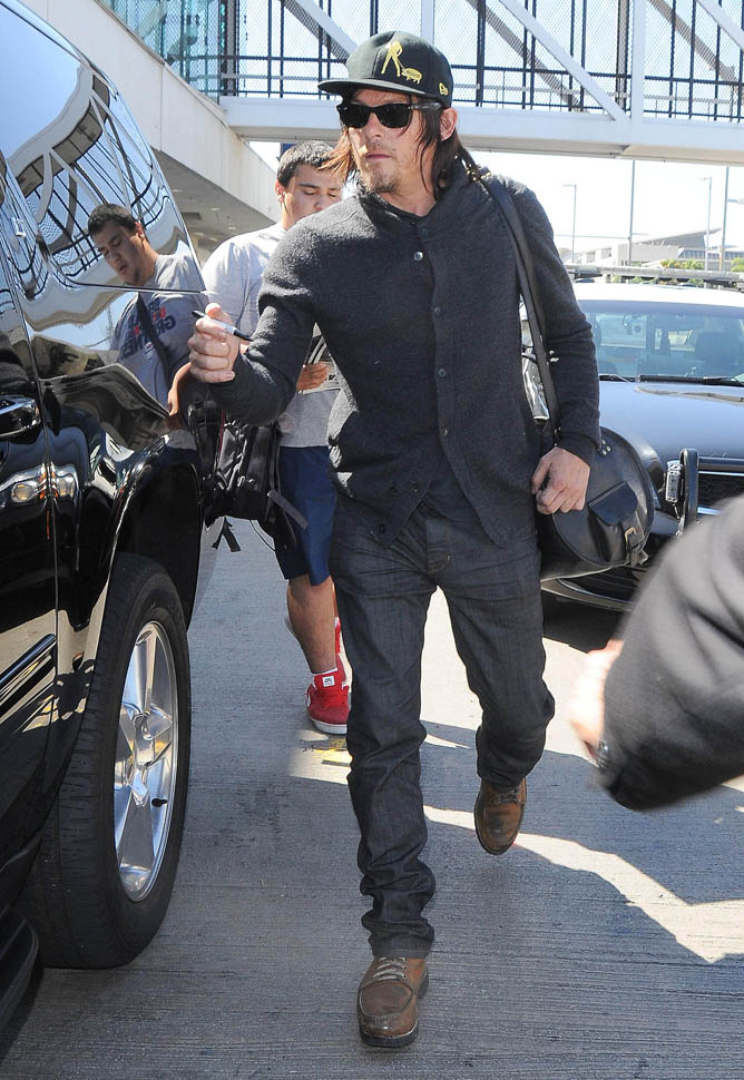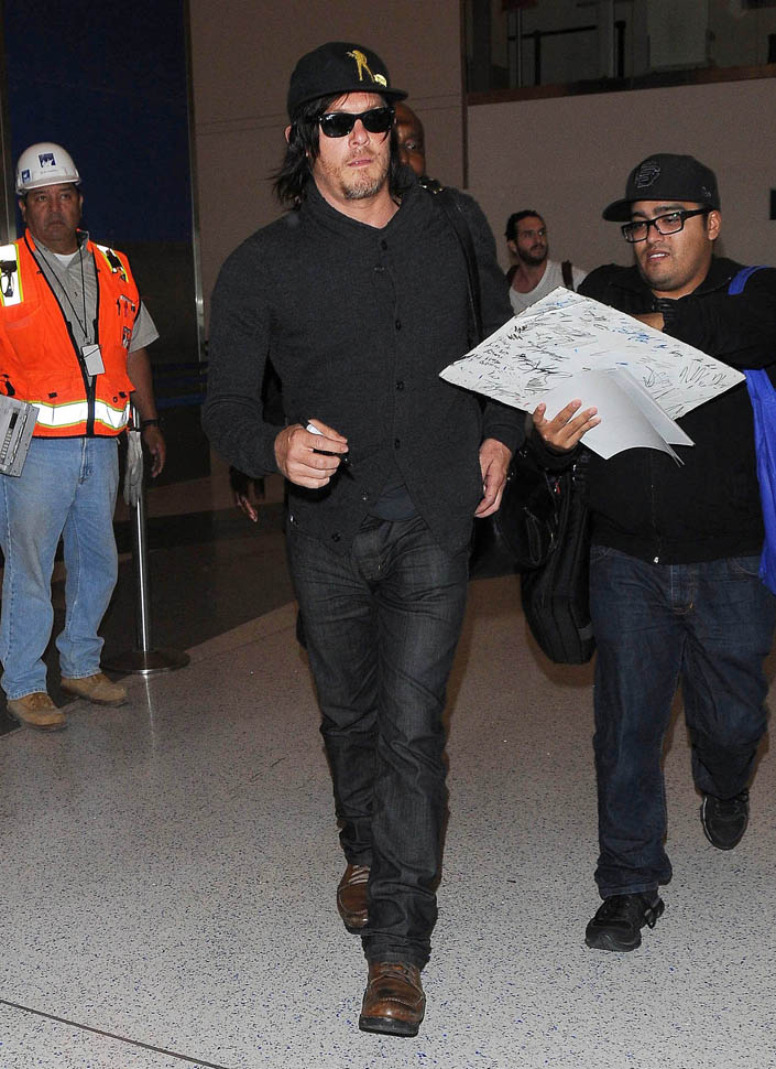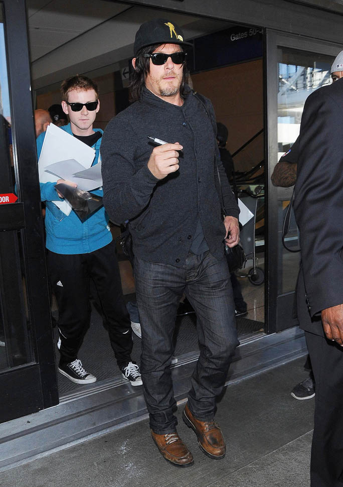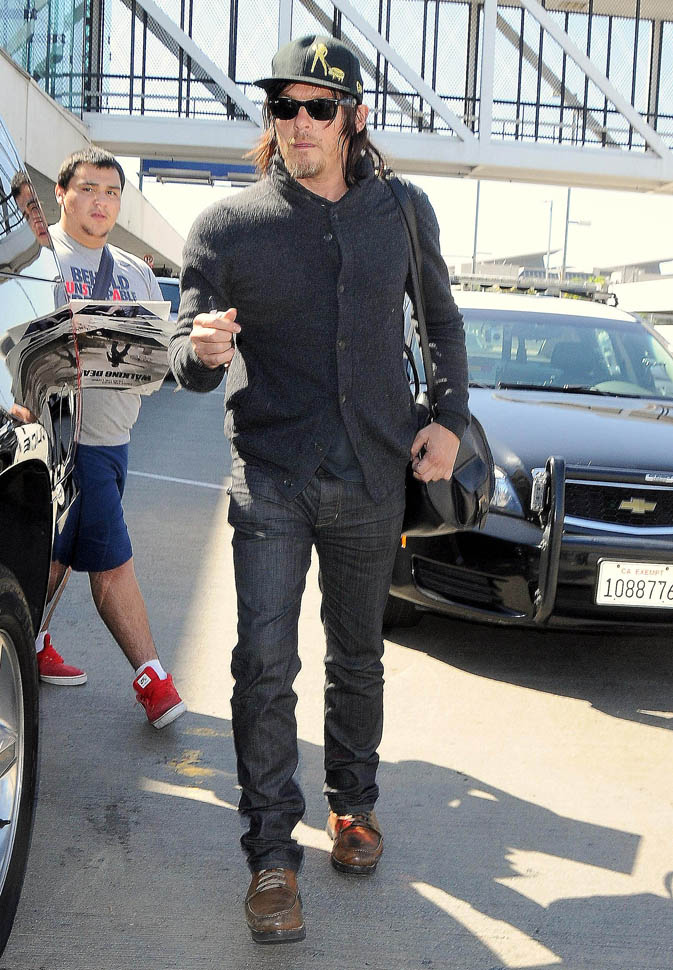 Norman Reedus, Melissa McBride, and Andrew Lincoln were all photographed at the airport yesterday, arriving in LA no doubt to do some promotion before the premiere. I like Lincoln so much more in Rick drag, but Reedus… Biceps aside, I don’t get it. Ever. (Lainey: on the contrary, I feel it.)