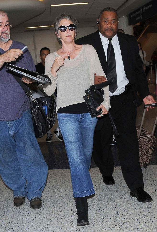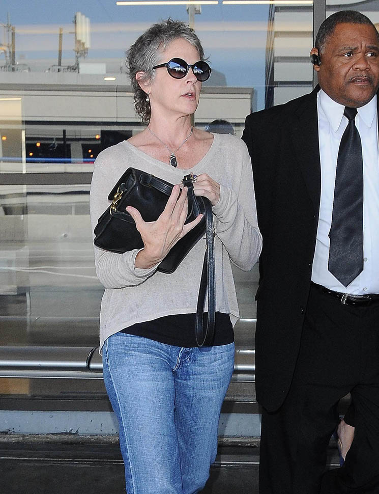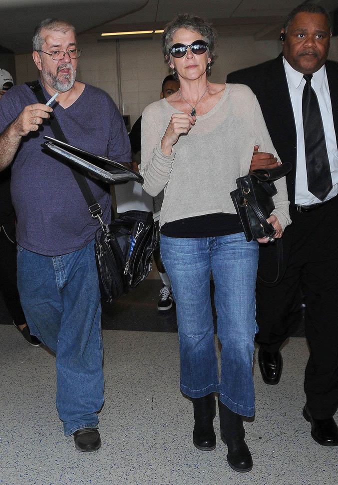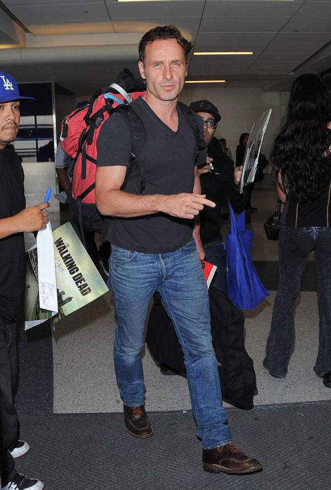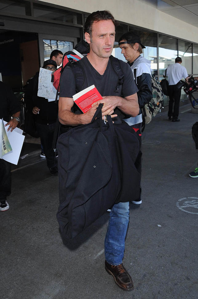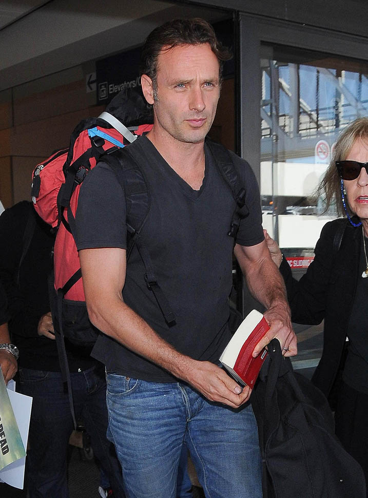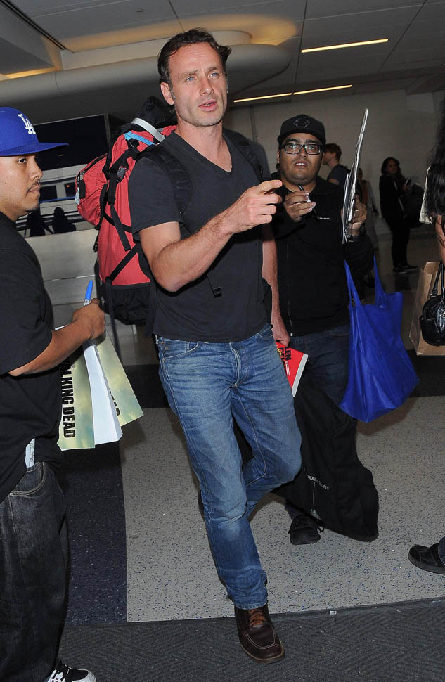 Norman Reedus, Melissa McBride, and Andrew Lincoln were all photographed at the airport yesterday, arriving in LA no doubt to do some promotion before the premiere. I like Lincoln so much more in Rick drag, but Reedus… Biceps aside, I don’t get it. Ever. (Lainey: on the contrary, I feel it.)