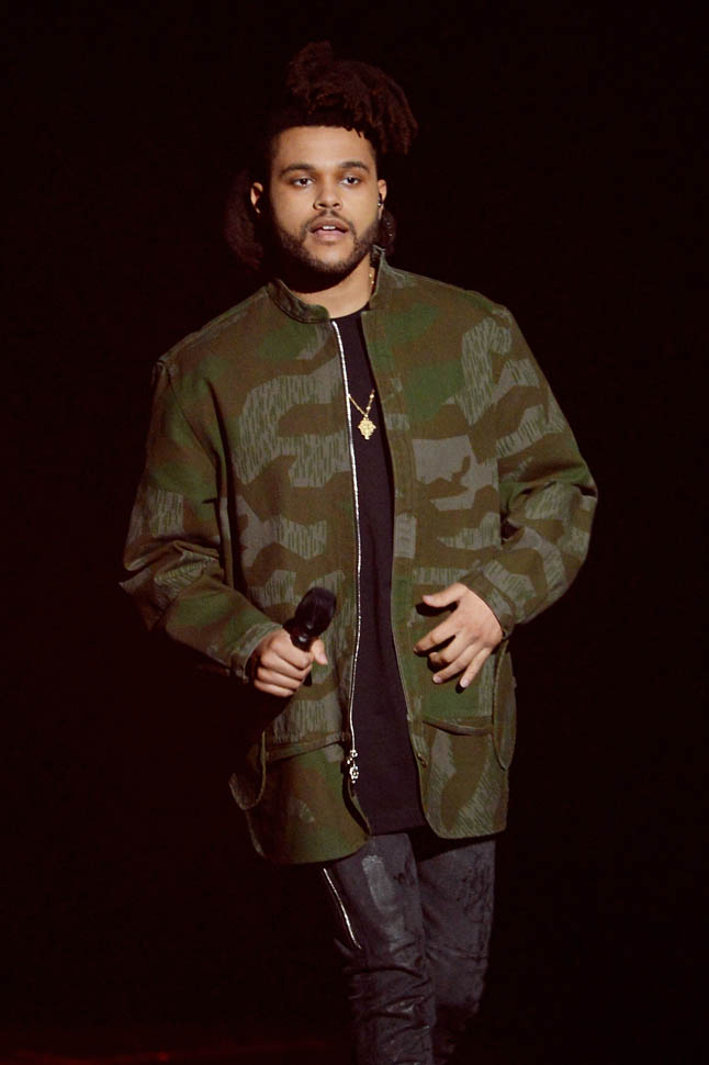 The Weeknd is wearing Mr. Completely Fall 2015 Banded Camouflage Field Jacket and Trafford Jeans in black clay.