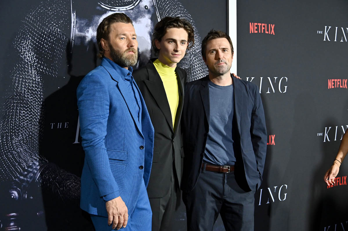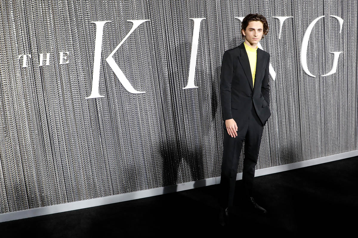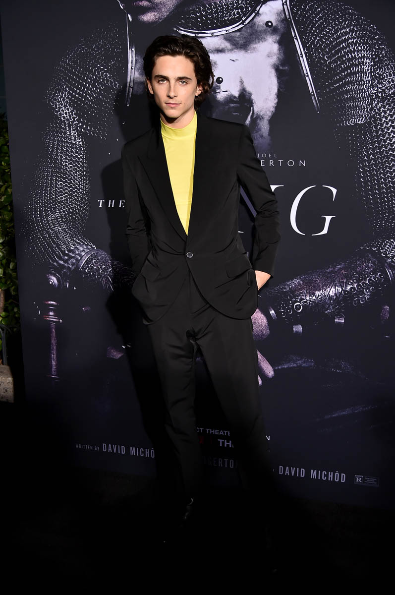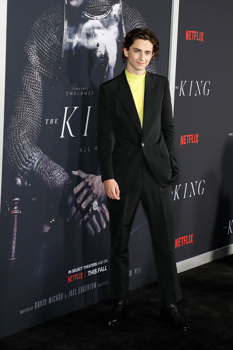 The King premiered in New York last night and the film’s king, Timothee Chalamet, showed up in a beautifully cut black suit over a yellow mock turtleneck. Like, stop it. STOP. He’s so f-cking pretty, I can’t stand it.