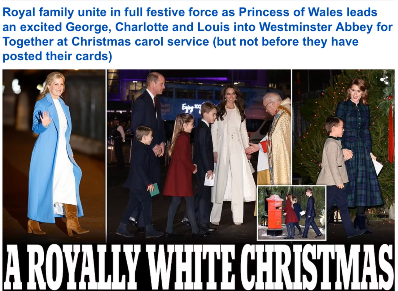 “A ROYALLY WHITE CHRISTMAS” – it wasn’t snowing and only two out of the eight royals pictured were wearing white. What do you think they could have possibly meant?!