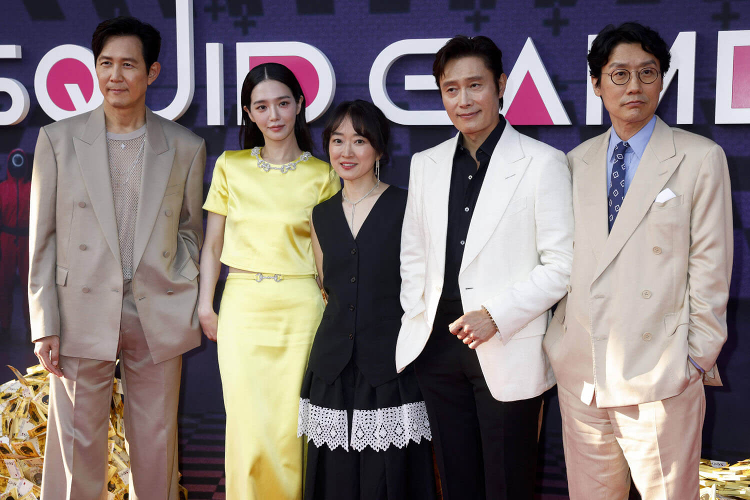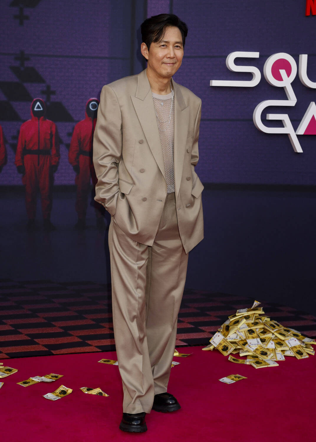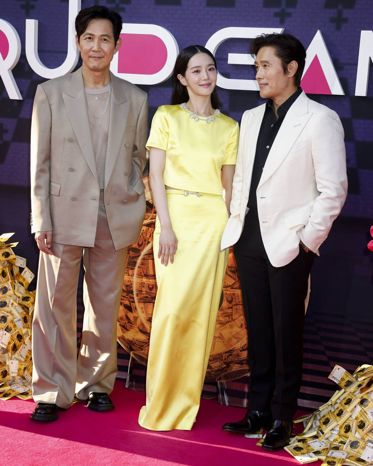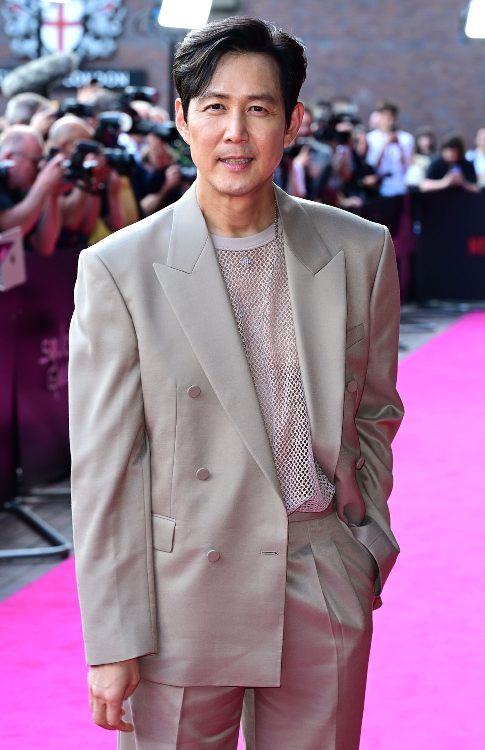Lee Jung-jae, Lee Byung-hun, and Park Gyu-young were on hand for the premiere. Lee Jung-jae looks GREAT in that suit, with the mesh shirt and silver chain.