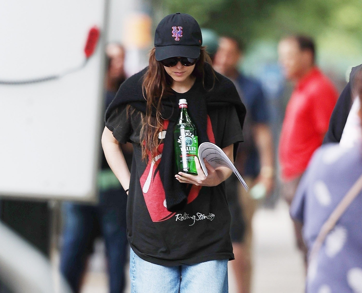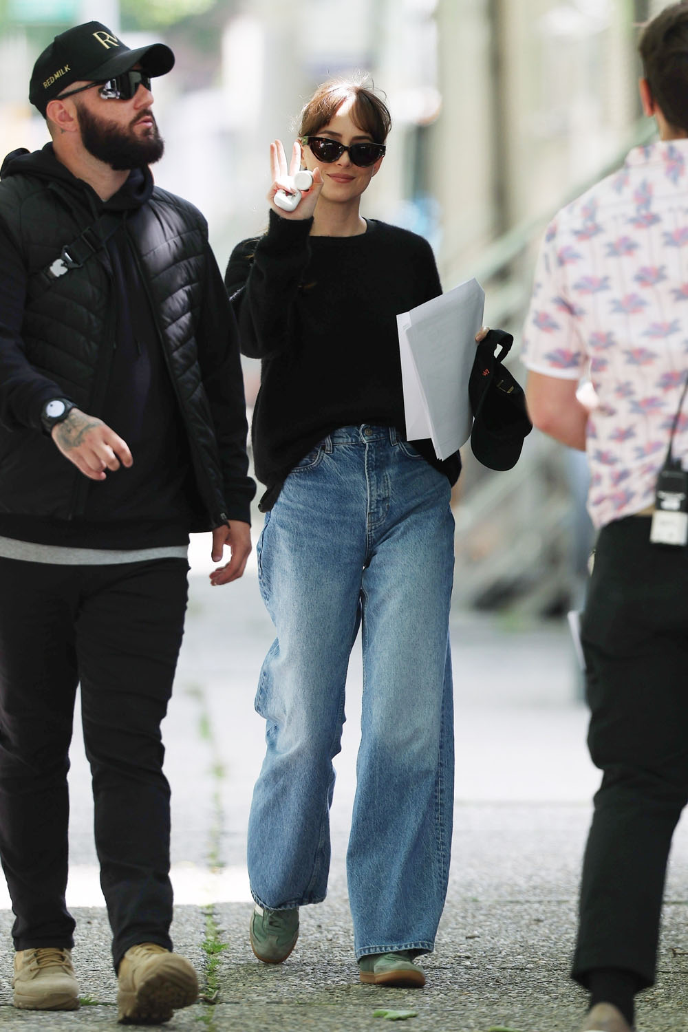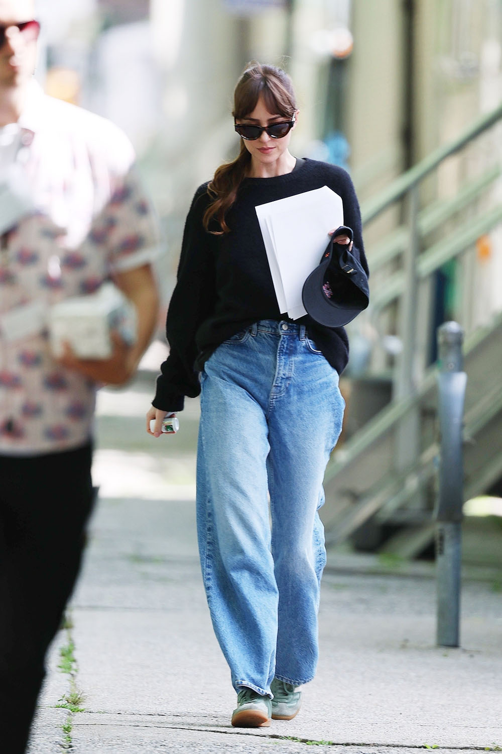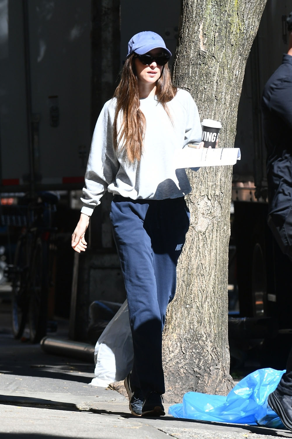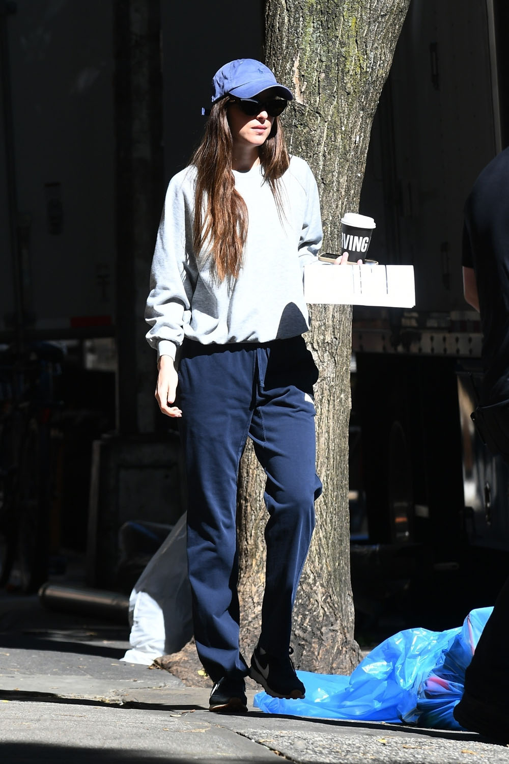 Filming of Celine Song’s Materialists continues in New York, and I thought I was the only one salivating over maybe-single Dakota Johnson’s character’s wardrobe, but apparently, a bunch of you asked Maria to source her fits, so I am not alone in wanting all of these clothes. Most recently, she repeated the blousy button down and pin stripe skirt from earlier this week, this was extremely my office style before my workplace changed its dress code to casual (because, and this is true, I told the top boss we would never hire/retain Gen Z workers if we didn’t let them wear hoodies in the office, but really, I just wanted to wear hoodies in the office. Now I don’t even work in the office!).