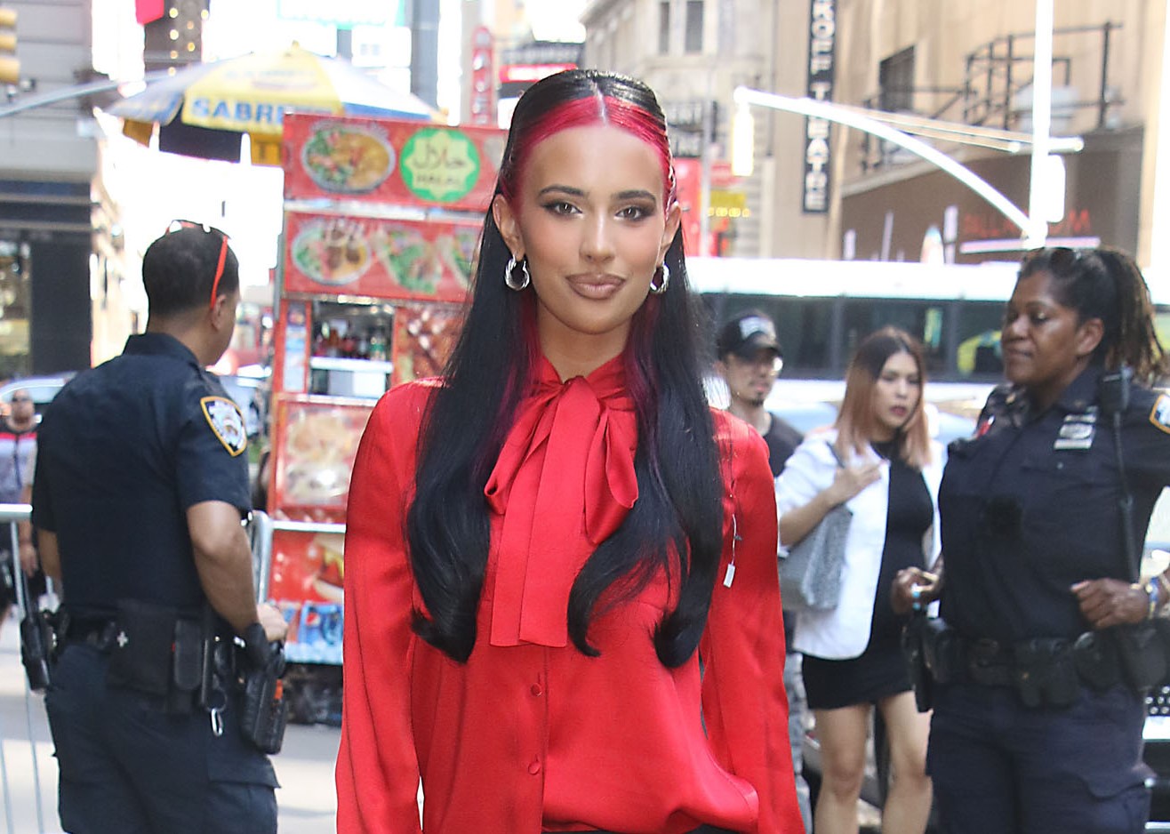 Everyone under 25 probably knows Kylie Cantrall because of Descendants: The Rise of Red. She plays red, and her mother, the Queen of Hearts, is played by Rita Ora. Rita was all about red on the press tour and like mother like daughter because Kylie is doing the same thing and this is a cute outfit but one of my style antis is that I don’t love a black tight with a different colour shoe. This, however, does not apply to fishnets. I’m probably alone on this. (GoFugYourself)