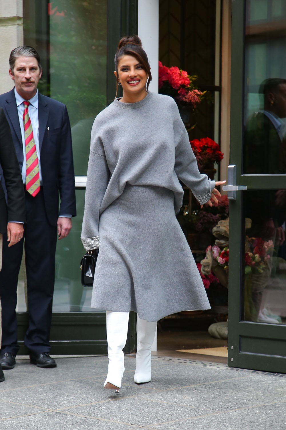 I really really love this grey leisure set on Priyanka Chopra. First of all, it looks so comfortable, I want to touch this material. Next – the perfect shade of grey, buttery and rich. And notice the subtle luxury in the cuffs. Excellent decision to pair with white boots. (Go Fug Yourself)