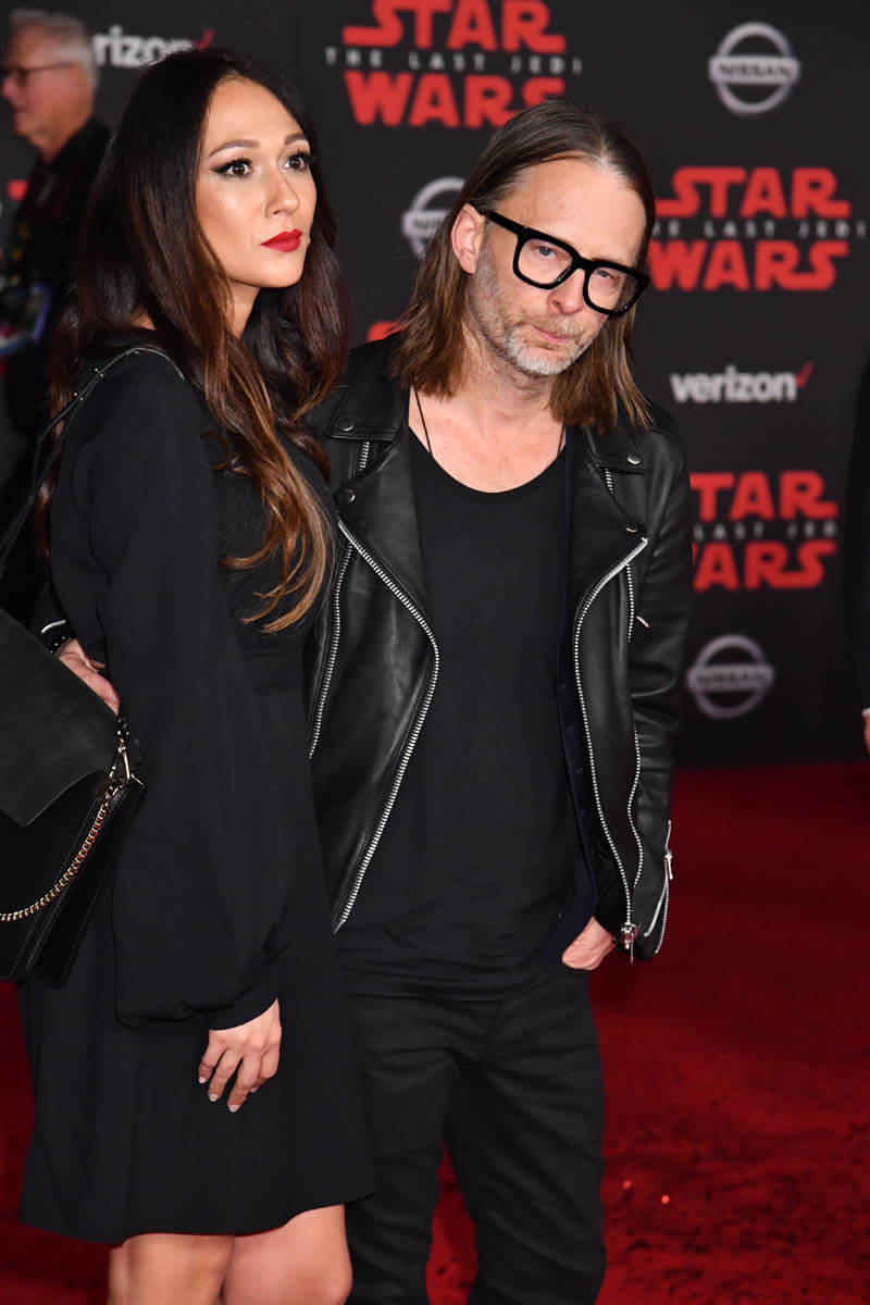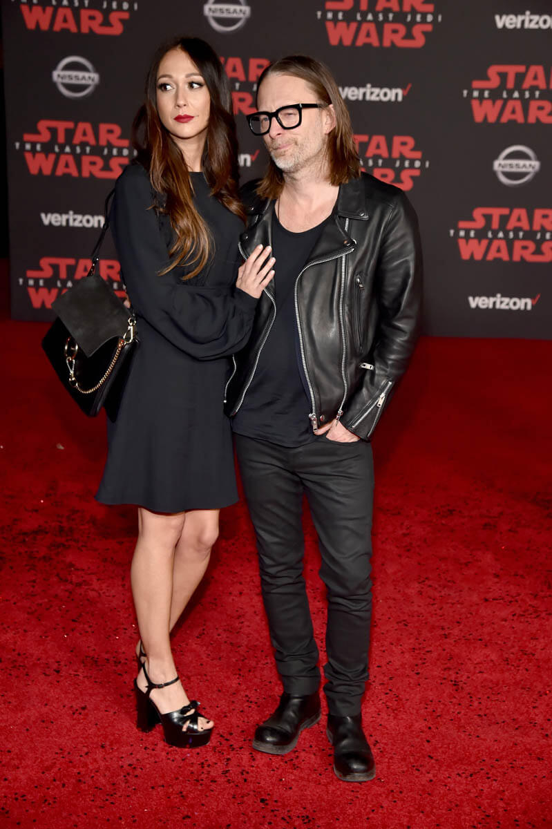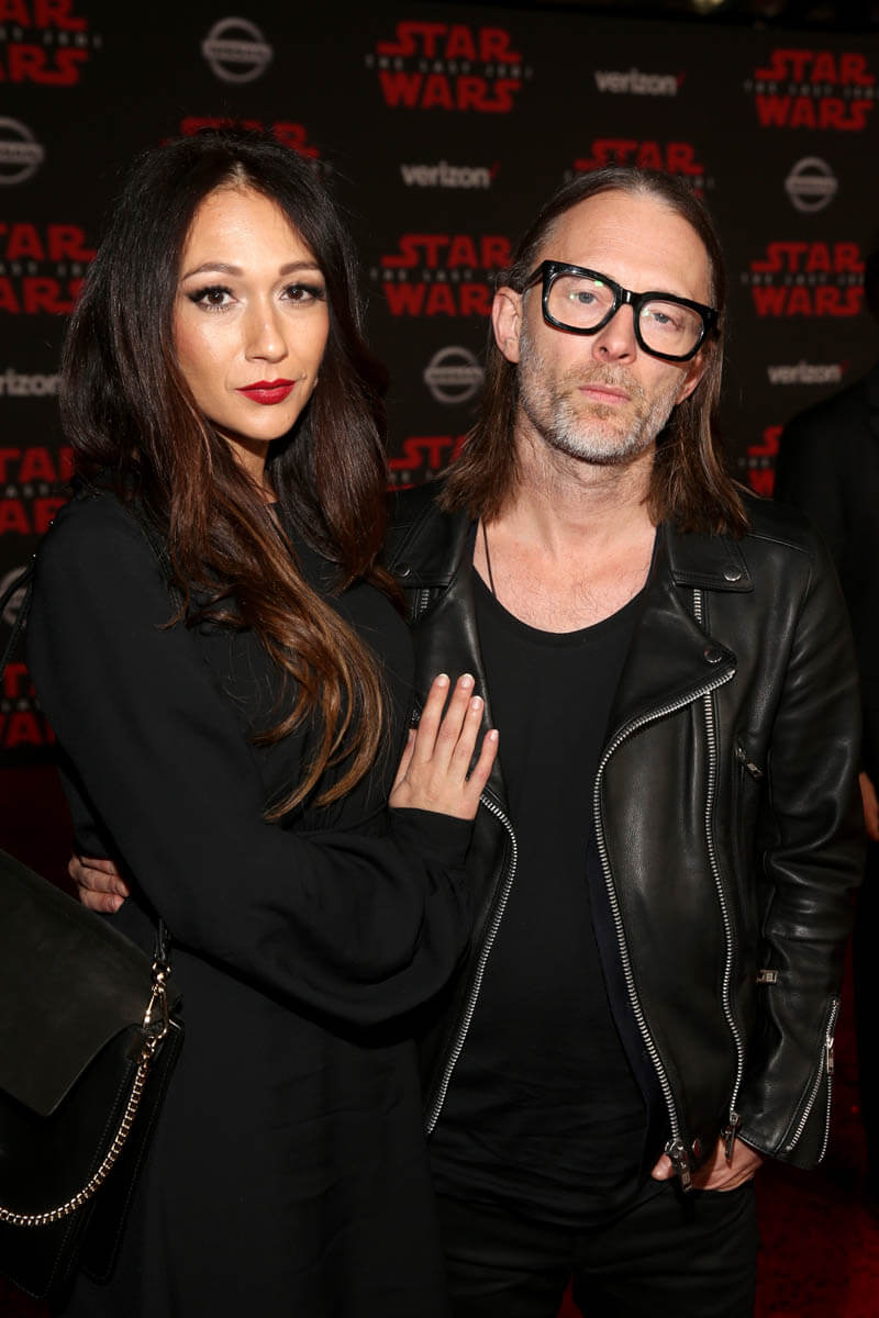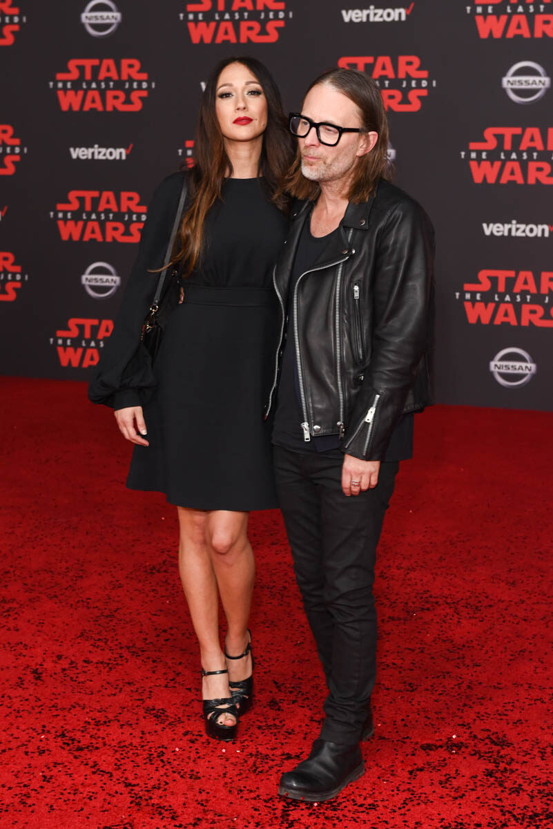 I mentioned Thom Yorke at the end of the previous post about Oscar Isaac and how he’s rarely on a red carpet. Which is why I’m turning this into a standalone post. Thom Yorke showed up at the Star Wars: The Last Jedi premiere in LA this weekend. Thom Yorke on a red carpet, not an everyday occurrence. Thom Yorke on a red carpet with his girlfriend, Italian actress Dajana Roncione, also not an everyday occurrence. I think it might actually be a first time occurrence? You can tell that it doesn’t happen often – or not at all – because of how hilariously uncomfortable he looks. I can’t remember Thom ever walking a carpet with his longtime partner Rachel Owens. But that’s where our story takes a sad turn. Thom and Rachel announced their amicable separation in 2015. She died of cancer late last year. The 20th anniversary reissue of OK Computer, released this past summer, was dedicated to her.
