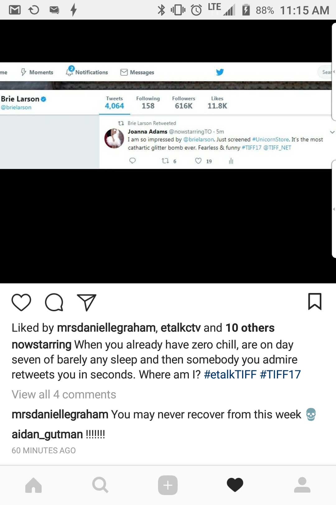 I thought the tweet didn’t go through because about a second after I hit send, my phone went black. I just got a new phone about a month ago, and thought it might be a glitch. I ignored it. Then I looked down and realized what happened. Brie had retweeted me WITHIN SECONDS and was the first person to like and retweet what I wrote. Then I had to go back to work and try to go on to the next thing, but I was shaking. Me, the queen of zero chill, got instantly acknowledged by somebody who just made a movie about how it’s ok to have zero chill. I couldn’t keep the sobs in, but I just tried to work through it. And now here we are.