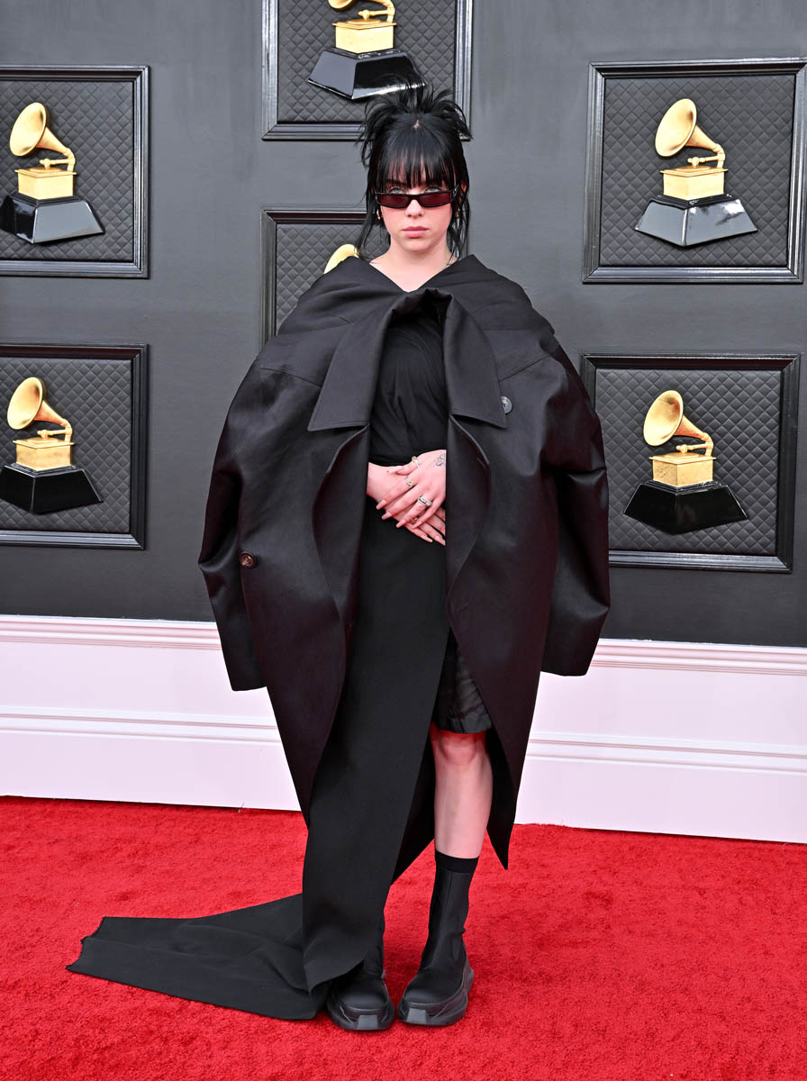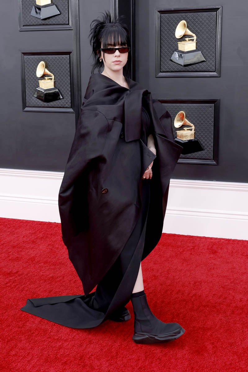 Billie Eilish might be trolling us at this point. Her Oscars outfit from last weekend was not well received and for the Grammys she decided to wear something pretty similar. This feels a little more inspired, I’ll give her that, since it’s repositioning a trench coat as a dress. But she’s once again committed to all black everything (from her hair down to those shin-high socks) on her very fair skin. The black backdrop on the carpet doesn’t help either. I love Billie’s point of view but I don’t think she’s found a way to translate it into fashion like I know she can.