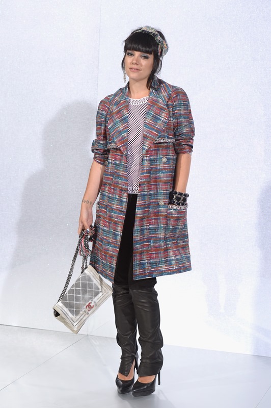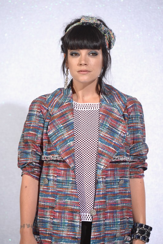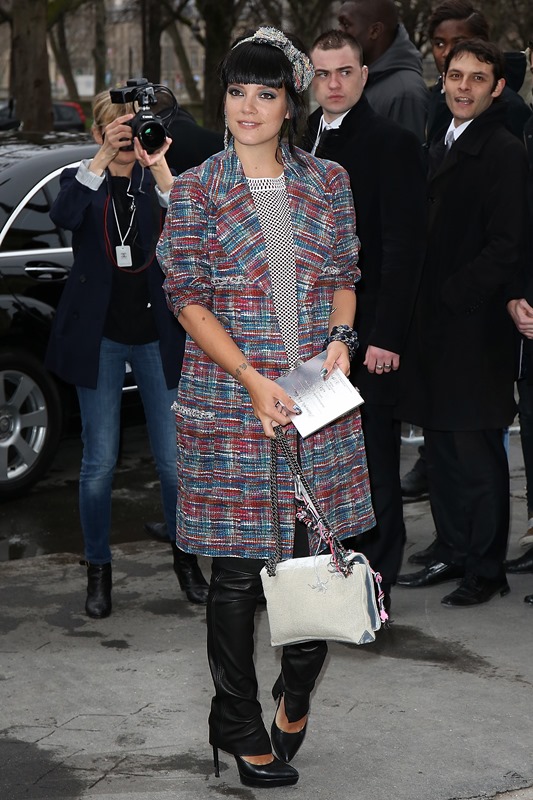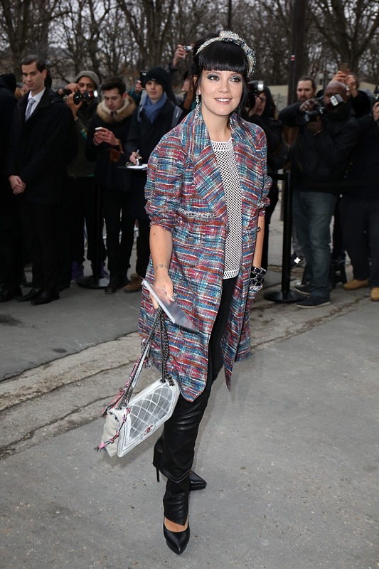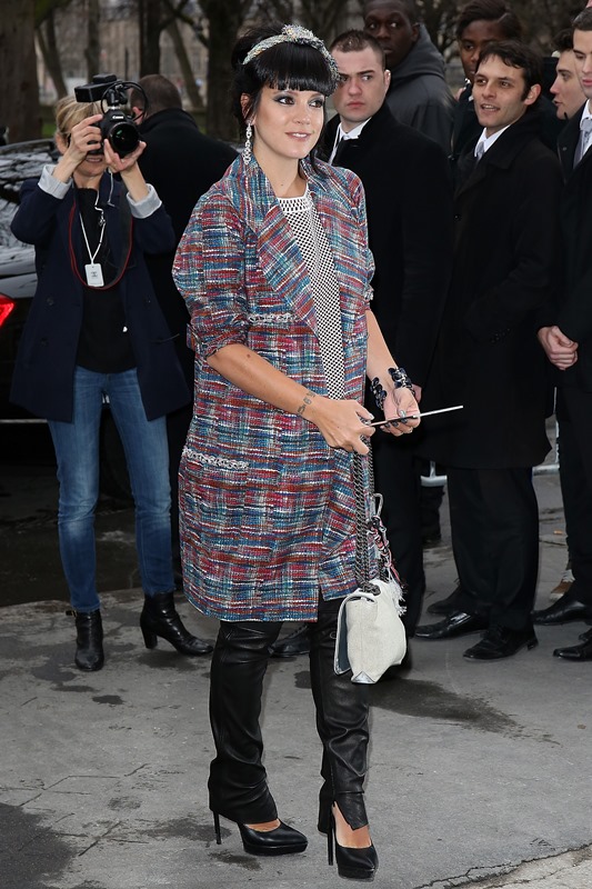 Lily Allen showed up at Chanel today. I just posted the collection in LifeStyle. Click here to see. Obviously she was dressed all over her body in Chanel, styled by Chanel. Which is why she looks so great. I’m about to rip that chain cuff off her wrist.