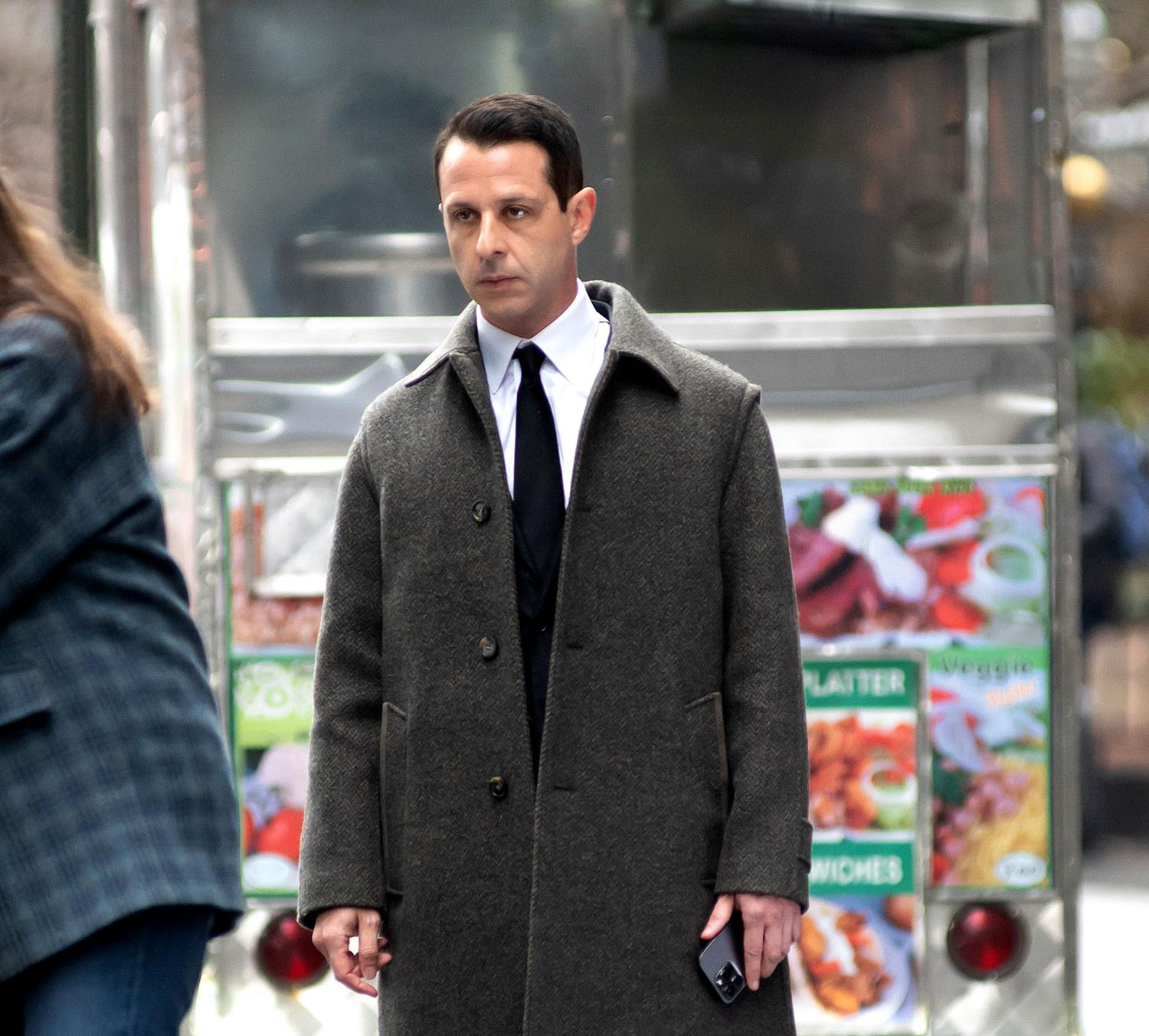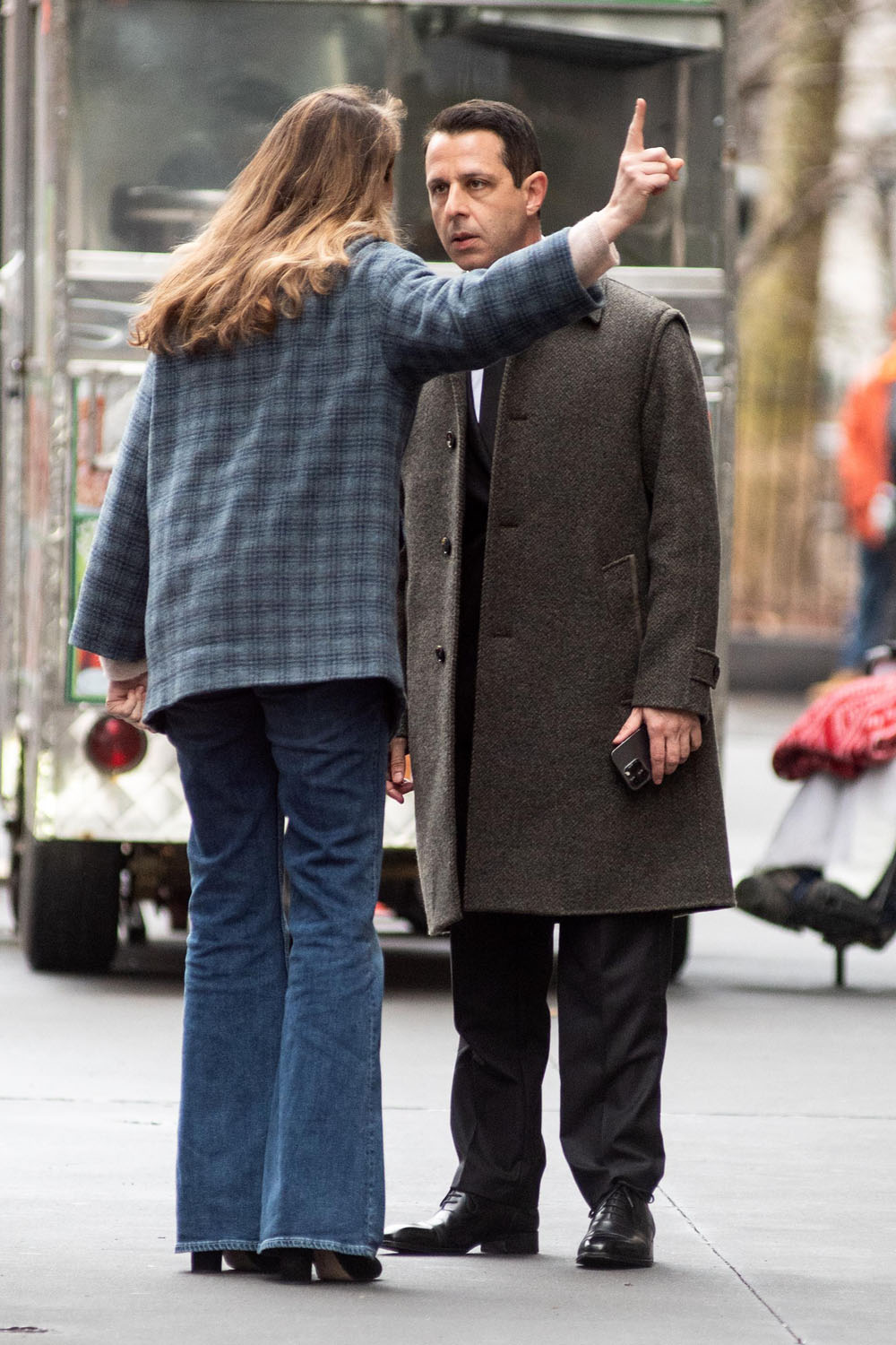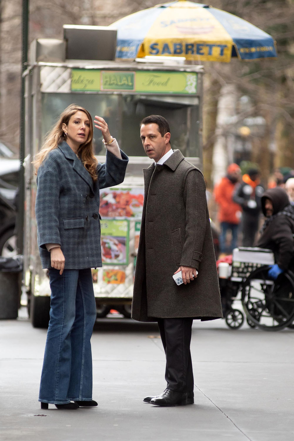 Attached- Jeremy Strong and Natalie Gold filming Succession earlier this month in New York.