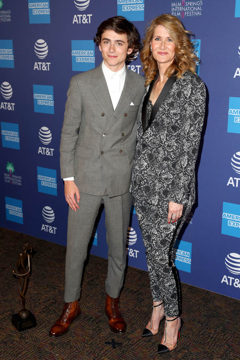 Last year at the Palm Springs International Film Festival, Timothee Chalamet received the Rising Star Award for his work in Call Me By Your Name. This year he returned to Palm Springs for the Spotlight Award, recognising his performance in Beautiful Boy. He was introduced to the stage by Laura Dern, with whom he just worked in Little Women. She gave him his trophy and a snack, a symbol perhaps of their older sister/surrogate aunt relationship. Laura Dern, as we know, doesn’t have to present anything to anyone. She was there because, clearly, she adores him. She made it clear that she adores him. “I love you! I love you!” is what she says just before bringing him into the spotlight.