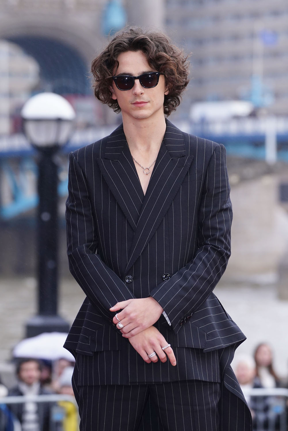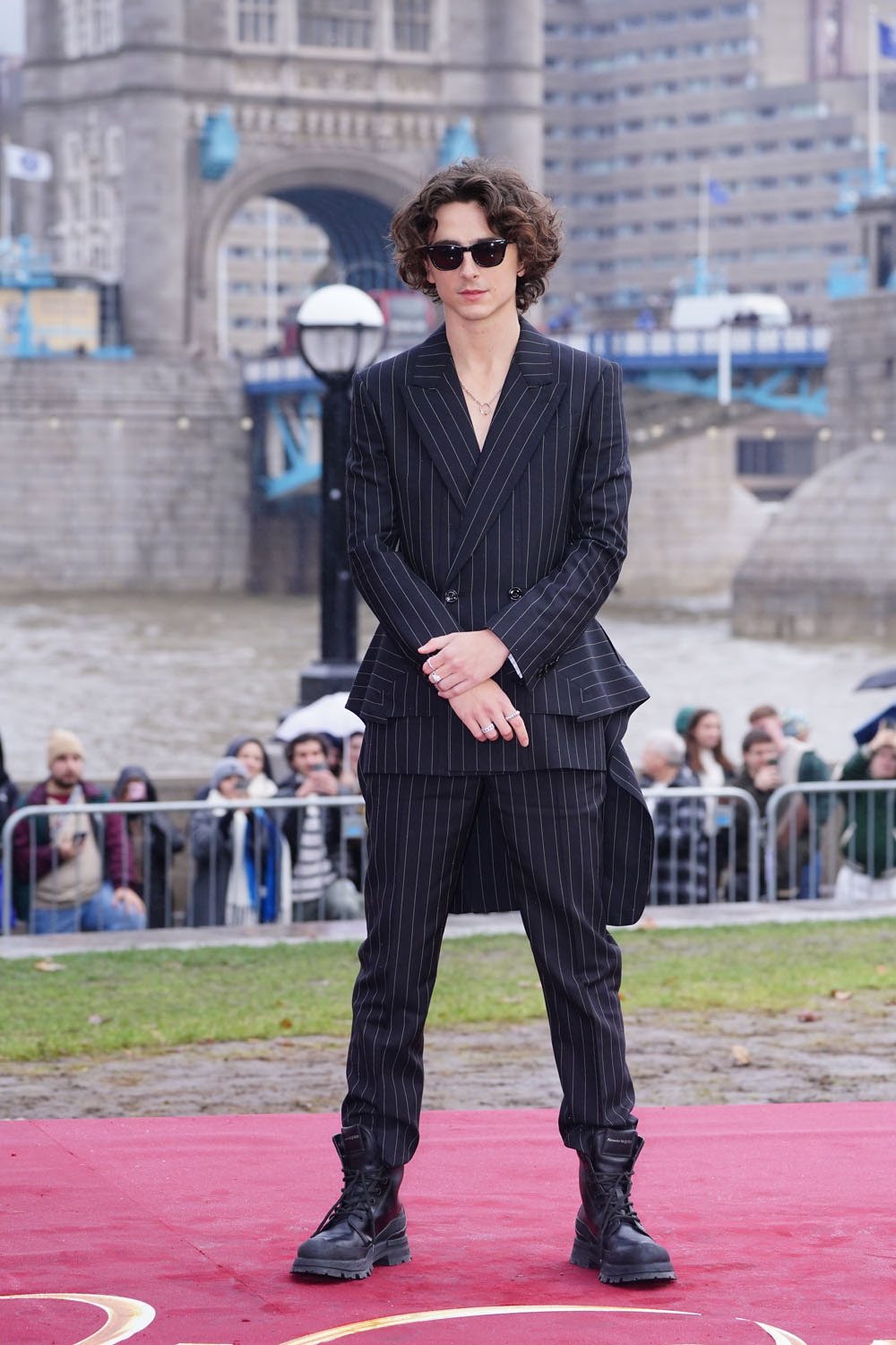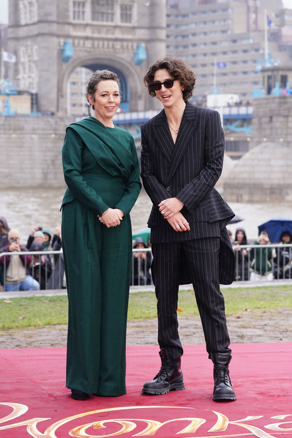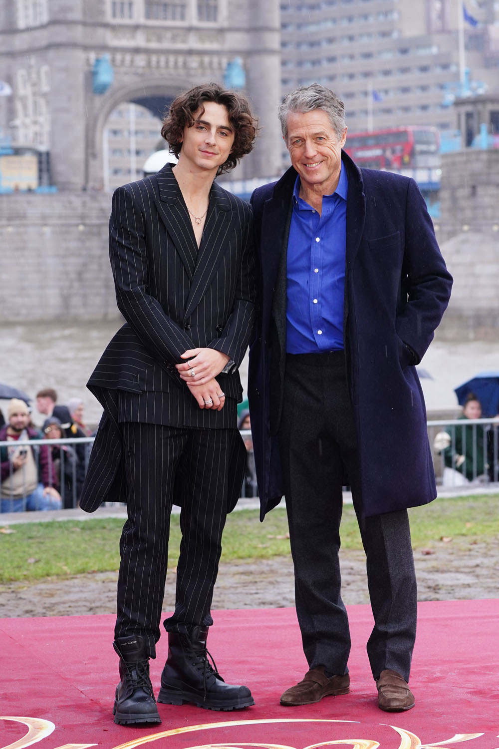 Before we get back to Gotham Awards madness, let’s take a brief break for the Wonka photocall yesterday in London. The actual premiere is today, which is why, I assume, everyone saved their best looks for later. Even Timothee Chalamet, a reliable red carpet star, dressed relatively down, by his own standard, in a pin stripe suit and boots. The suit has a little flair in the hem, but otherwise, this is about as lowkey as Chalamet gets at events. Still, the hair is exceptional, and Hugh Grant looks like he’s enjoying himself in Timmy’s company, which might bode well for Wonka. (I am putting off watching this movie for as long as possible!)