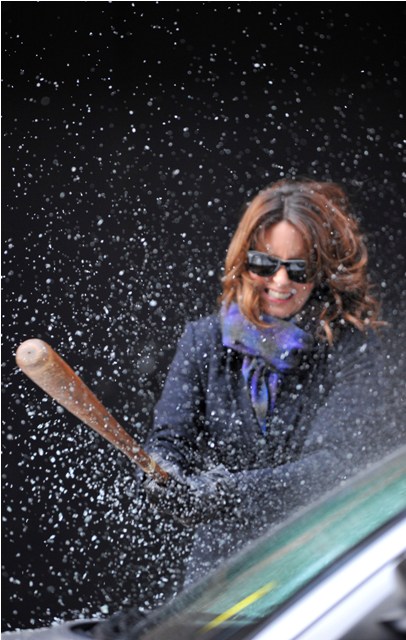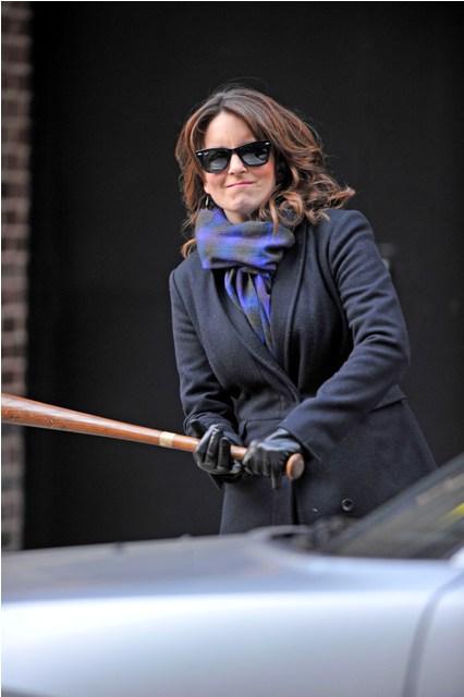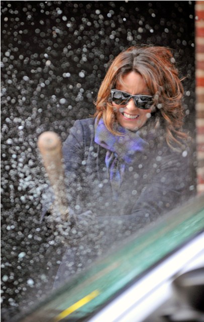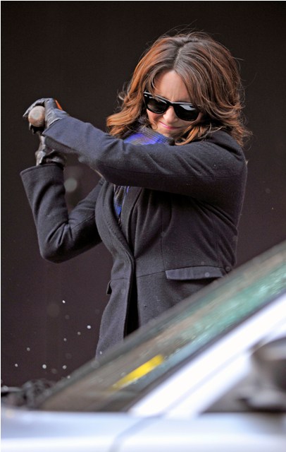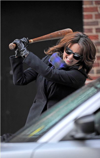 Not sure why she’s smashing up that car. Letterman will let you know tonight.