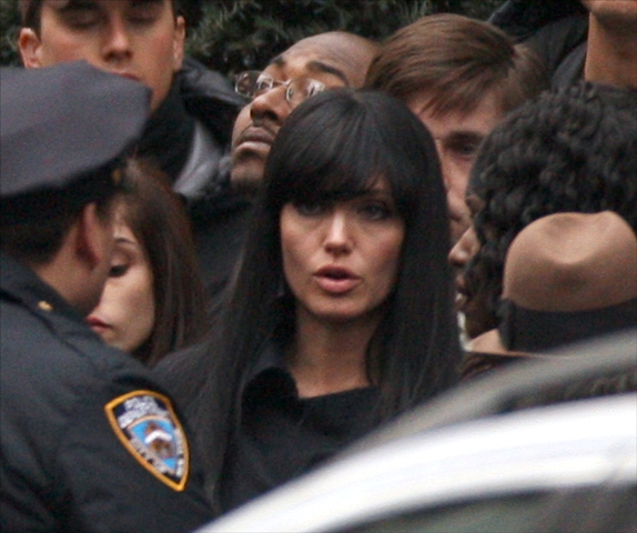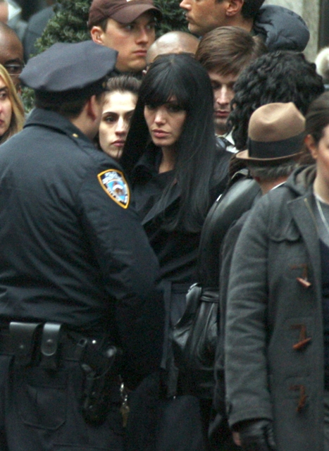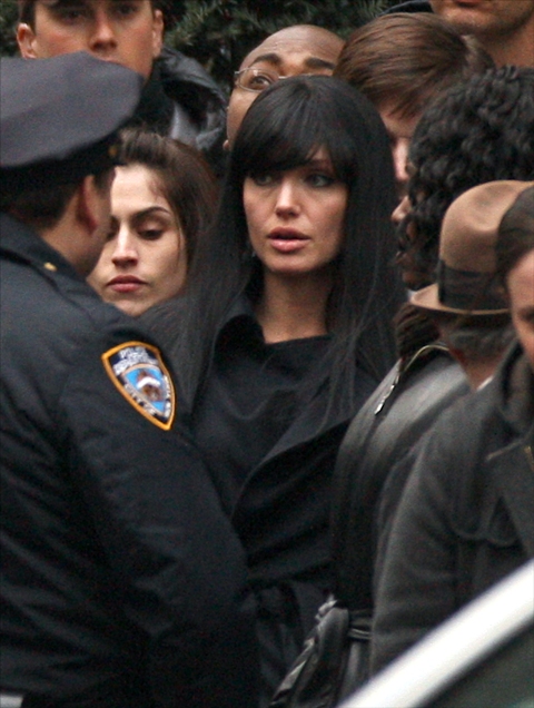 Angelina Jolie continued shooting Salt this weekend in New York, apparently finally done with the blonde wig scene and switching over to the black. Maybe it’s the lighting but that foundation…it’s too dark, non? And she looks super tired.