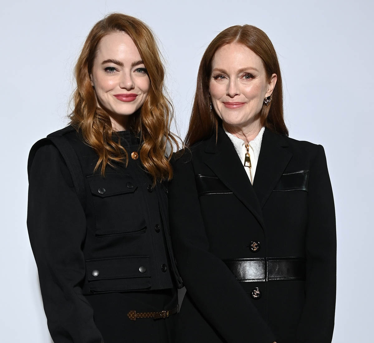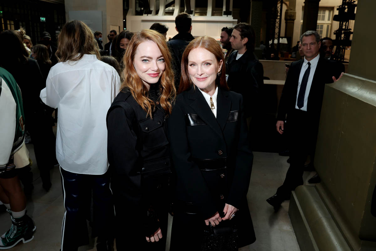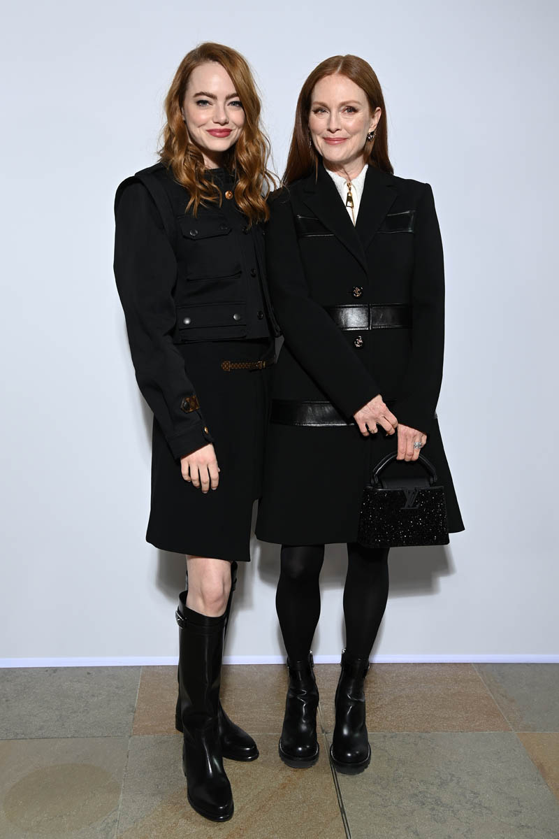 The Louis Vuitton show is always a big celebrity draw and after almost two years of restrictions, when so many people couldn’t travel, today’s presentation brought out the stars, some of whom haven’t been seen all that often during the pandemic. Like Emma Stone who matched in ginger and black with fellow Oscar winner Julianne Moore.