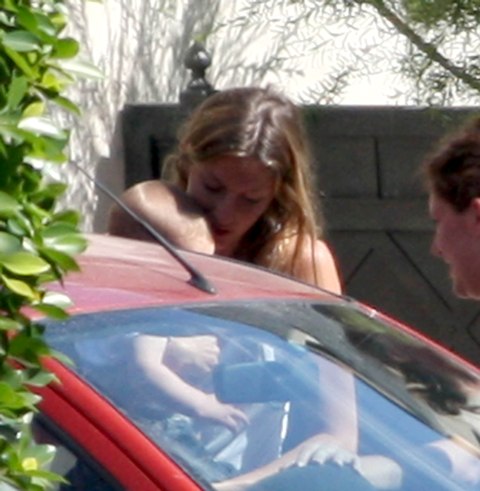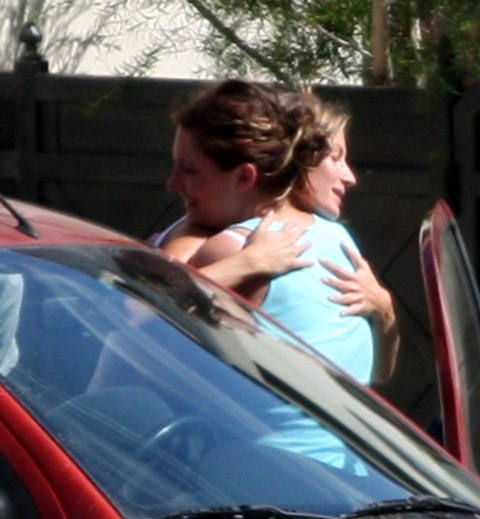 Tom Brady. Yum. He spent Father’s Day in LA with his son John and, of course, Gisele too. Looks lie G is bonding with the little guy. Attached – photos of Gisele holding the baby and of both hugging the nanny who came to pick him up.