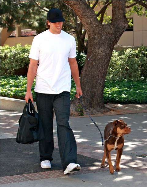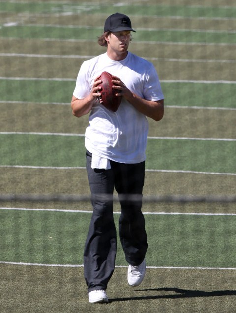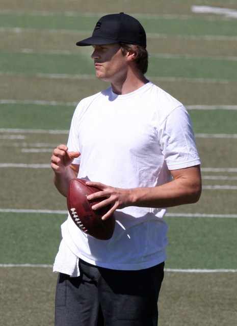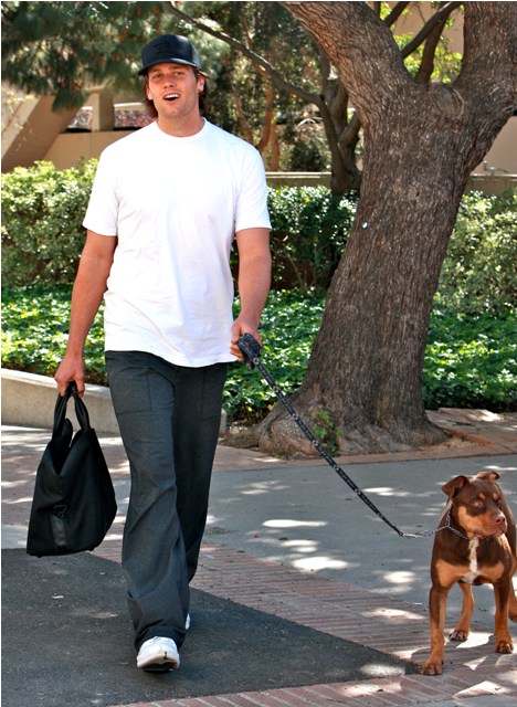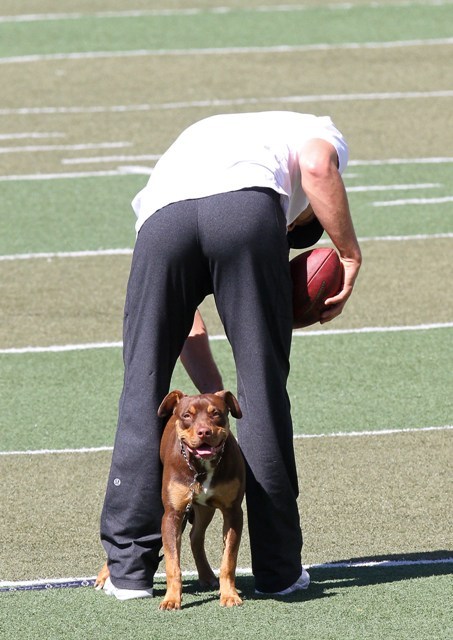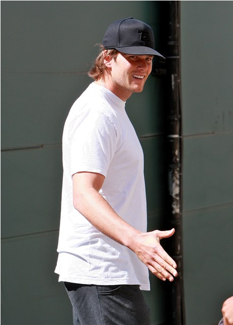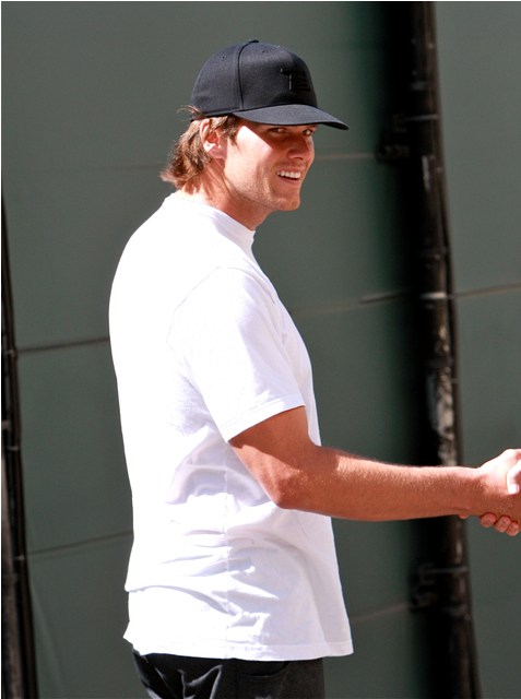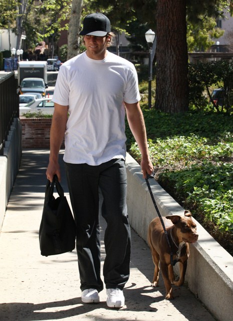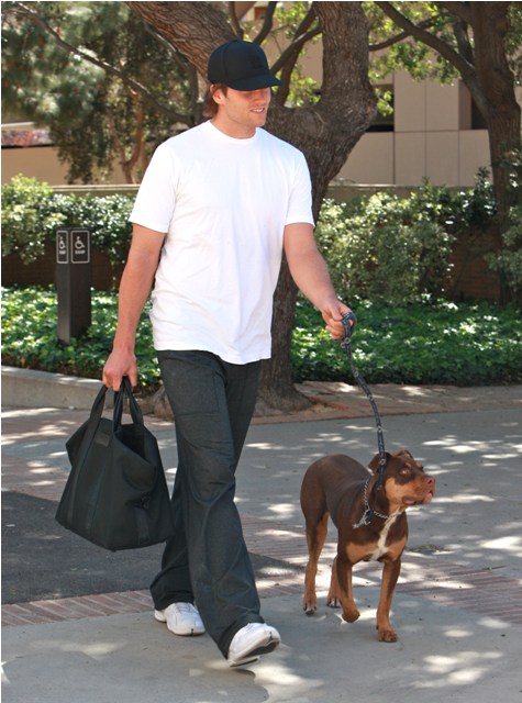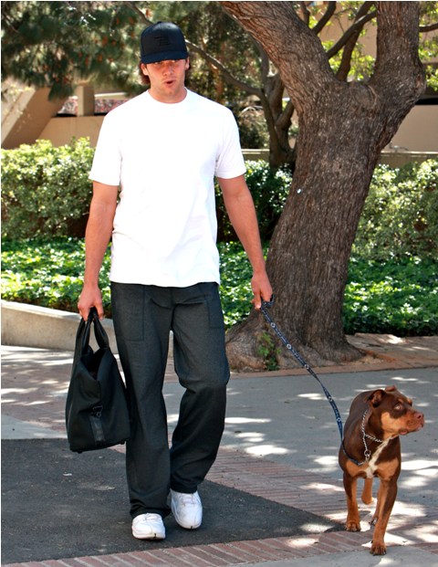So Tom Brady took the dog out this afternoon to throw the ball around in LA today. I love it when he lets his hair grow out like this. When it curls in wisps at the nape of his neck. Said it before, will say it again: we were there, on the field, at the Superbowl in Phoenix and he ran right by me during warm up and I told Michelle – he cut his hair, right before the final game of what was supposed to be a perfect season, he cut his f-cking hair. The Patriots will lose.