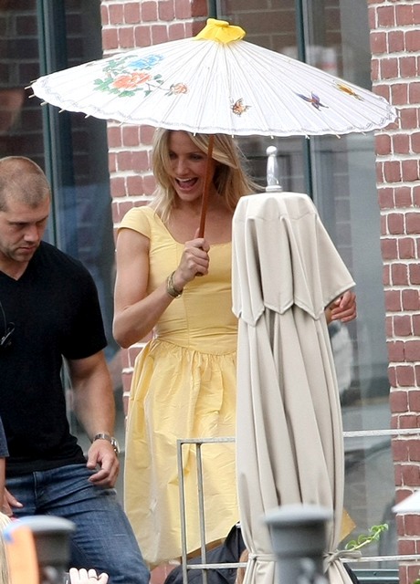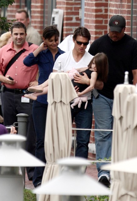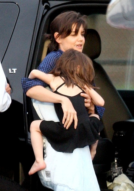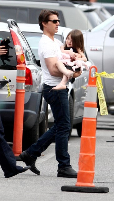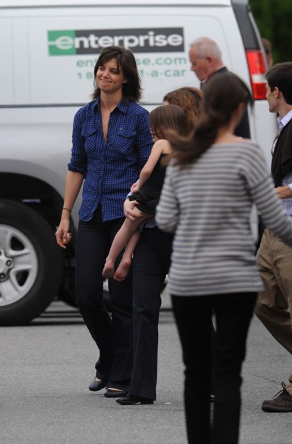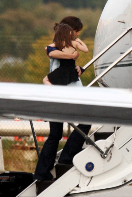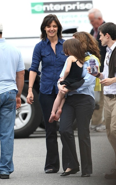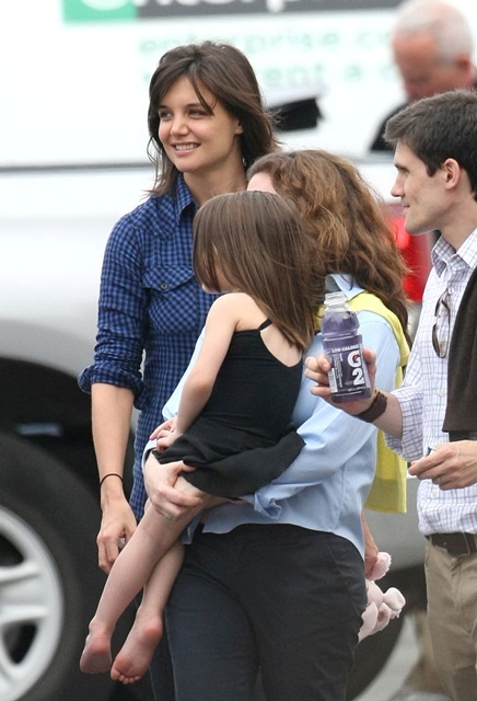Here he is on set with Cameron Diaz filming what looks like a testy scene. And then a visit with his wife and daughter before the two of them boarded a private jet – Katie and Little Sci off on their own. Katie is smiling….