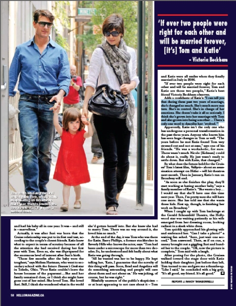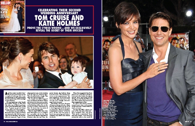 However despite the rumours and the bullsh-t headlines concocted by Life & Style, twice now proclaiming the end of the marriage, Tom’s hold on KatE is as firm as ever. And this article in the new issue of Hello Canada offers insight from “insiders” and even Tom and Robo themselves about the state of their union.