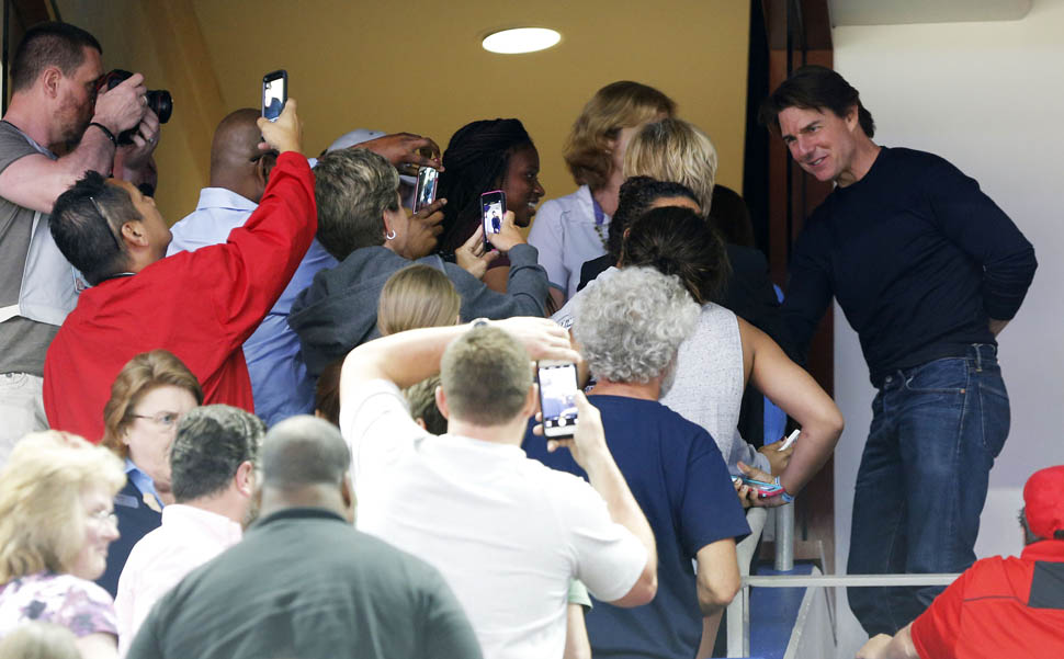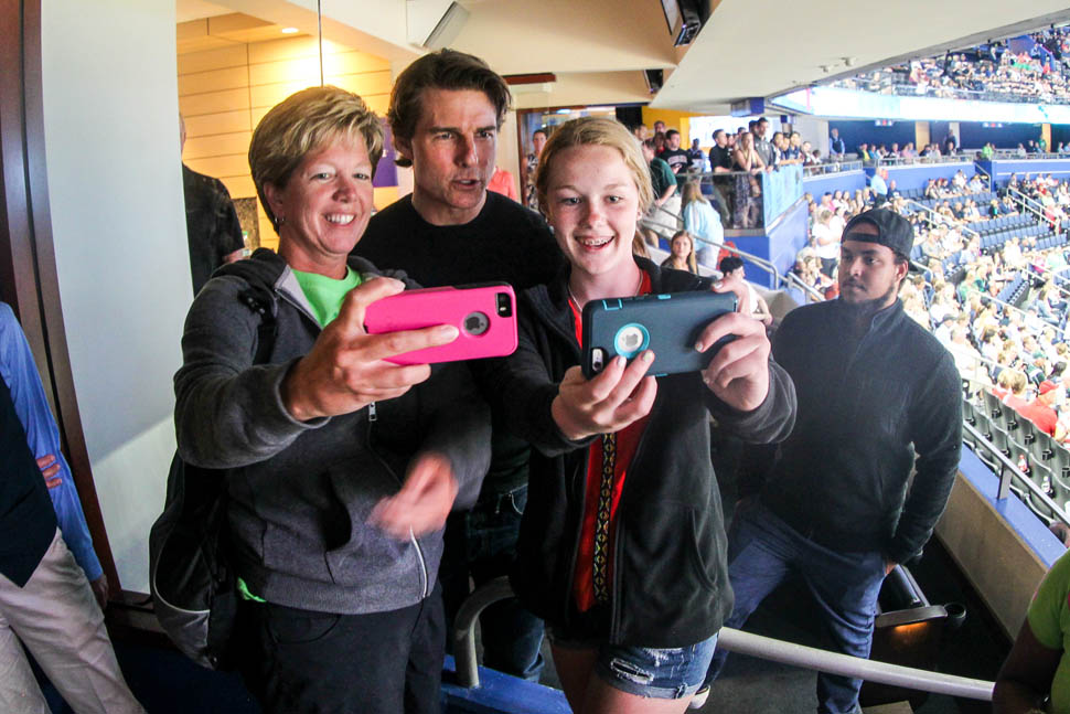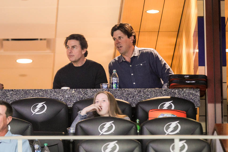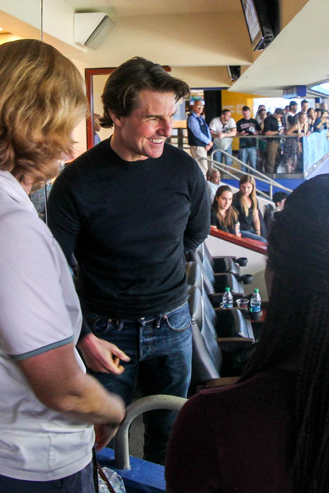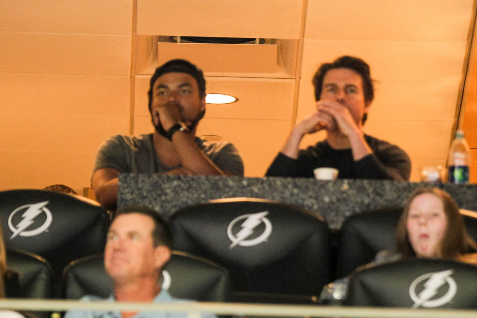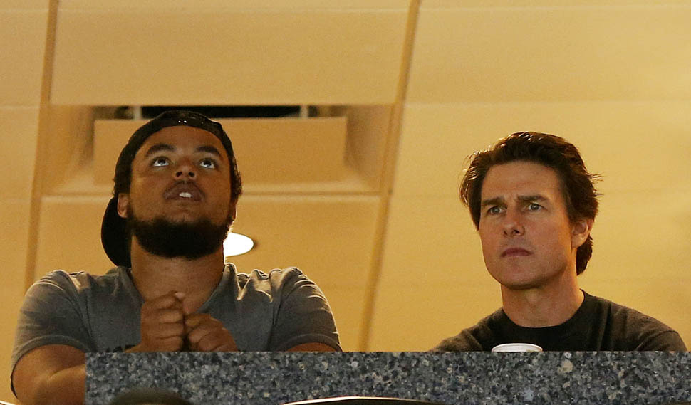Tom Cruise and son Connor were in Tampa, Florida last night watching the NCAA Women’s Final Four Semi featuring Maryland and Connecticut. Tom’s been in London for several months working on Mission: Impossible Rogue Nation. The movie opens July 31st. So I hope they’re done shooting. Because that doesn’t leave a lot of time in post.
