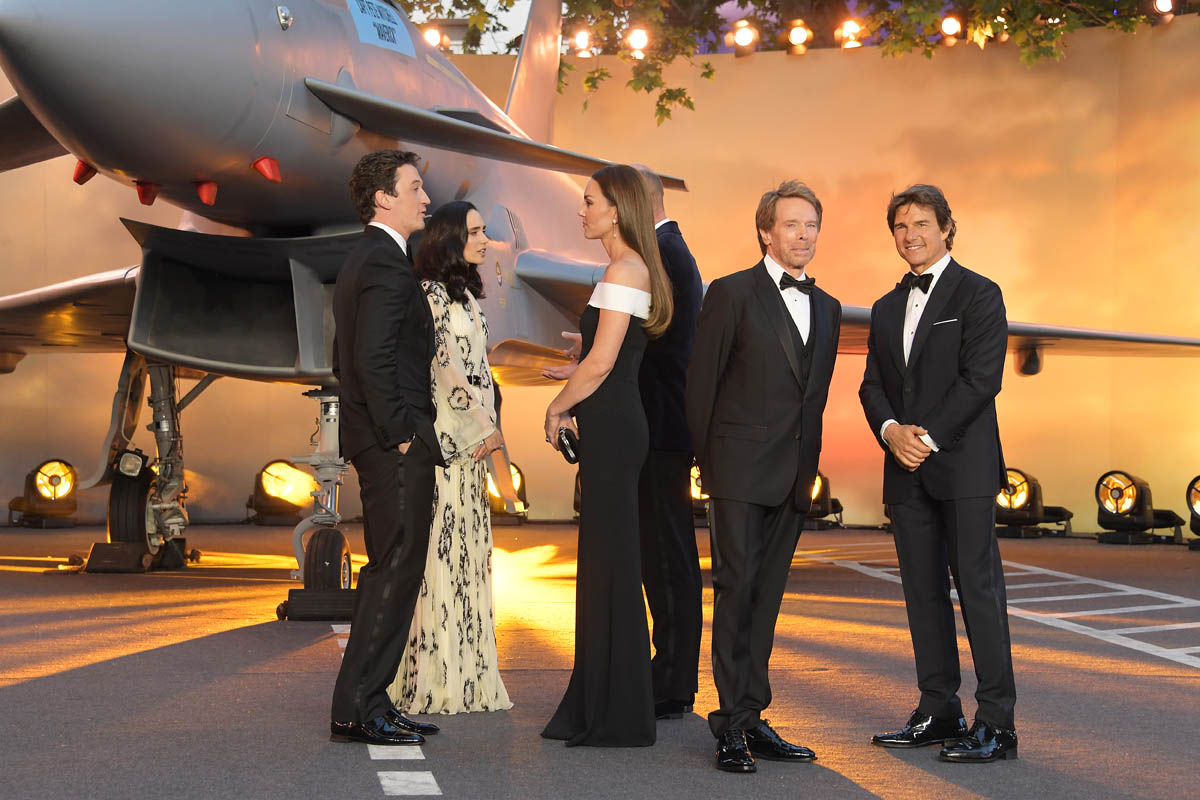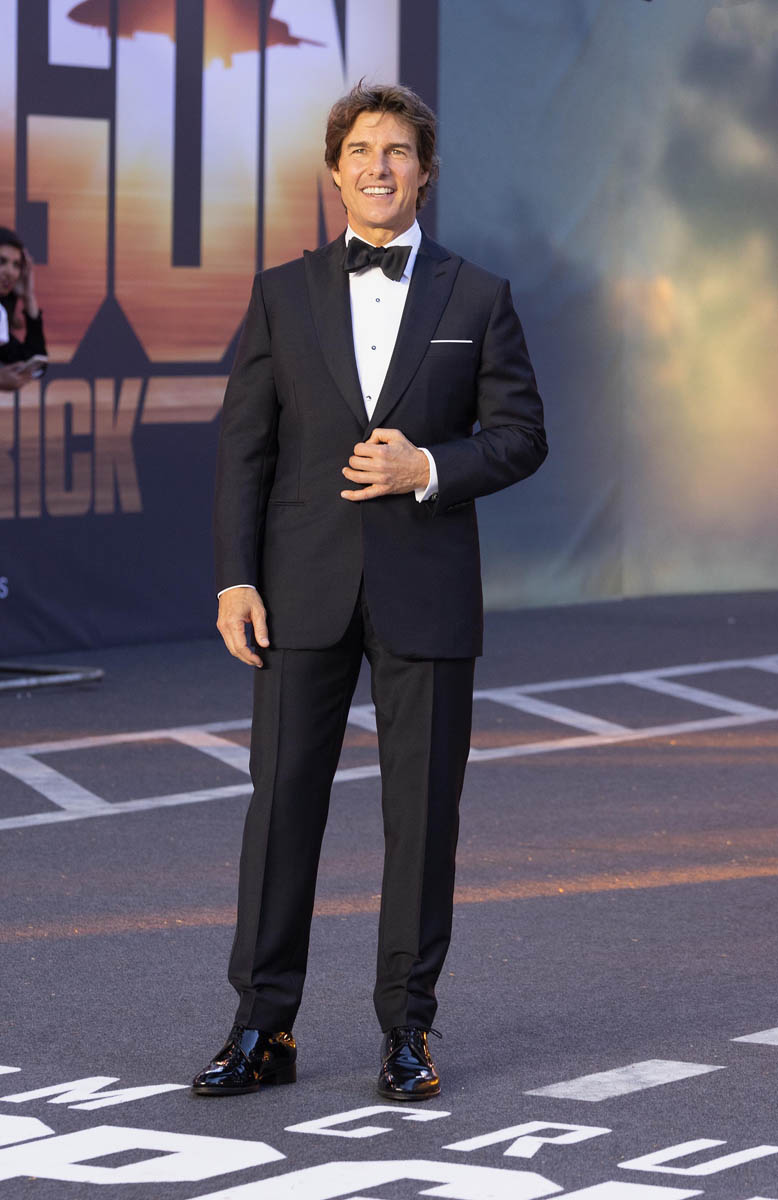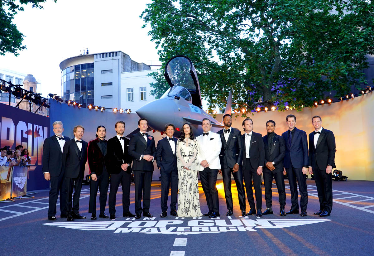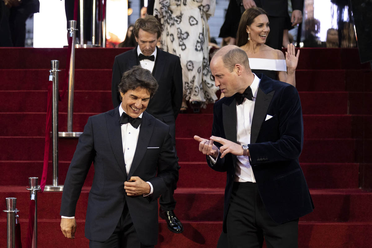 In London last night, the UK premiere of Top Gun: Marverick. And, naturally, because this is a Tom Cruise movie and Tom Cruise is always extra AF, they went full throttle with the presentation. Leicester Square was a spectacle, a huge maze of digital screens was set up outside the theatres, several stages were built for celebrity arrivals and interviews, and a display jet was brought in, with Pete “Maverick” Mitchell emblazoned across the side, to serve as a backdrop for the cast when they formed the assembly line to meet the attending royals, Prince William and Catherine of House Cambridge.