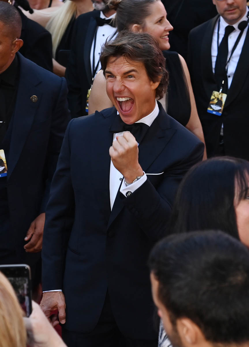 Tom’s hosting duties weren’t just limited to the royals either. There were three theatres connecting to the red carpet last night screening the movie in Leicester Square. After hosting Will and Kate’s arrival, Tom left them briefly while they met with guests from various charities to pop into each theatre with director Joseph Kosinski and Jerry Bruckheimer to give a short introduction. I was in the IMAX theatre and we were his first stop. He thanked people for coming, he told us how important it was to him that Top Gun be shown on the big screen, and he talked about how proud he was of the movie. The crowd went bananas for him. I was seated next to a group of air ambulance first responders who were fist-pumping the whole time. Speaking of fist-pumping…