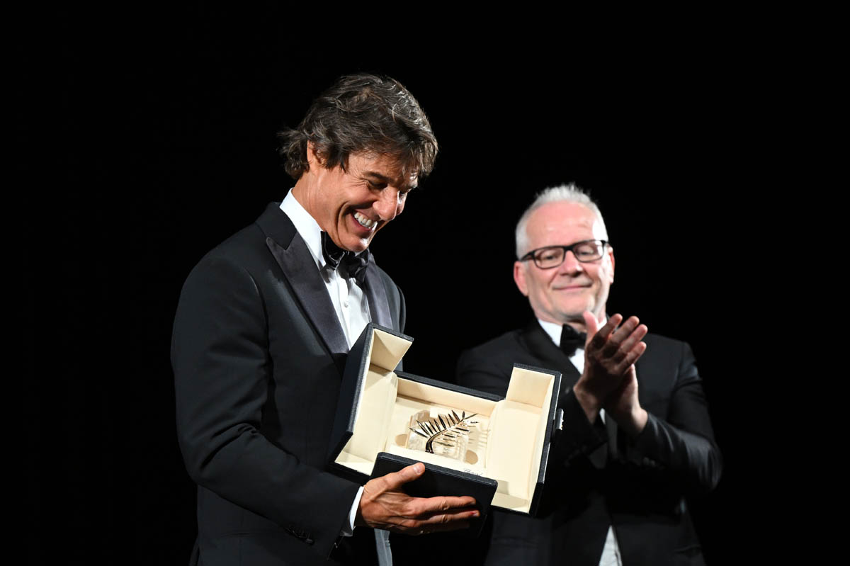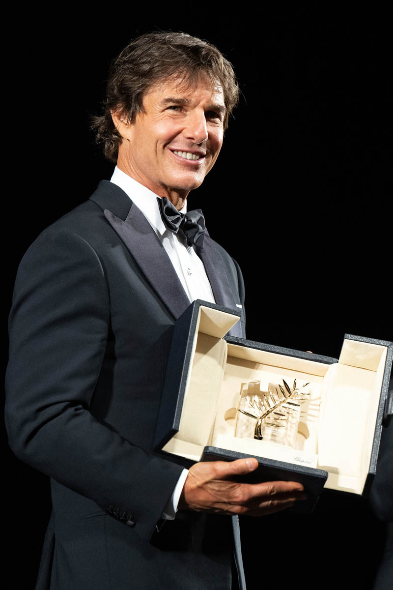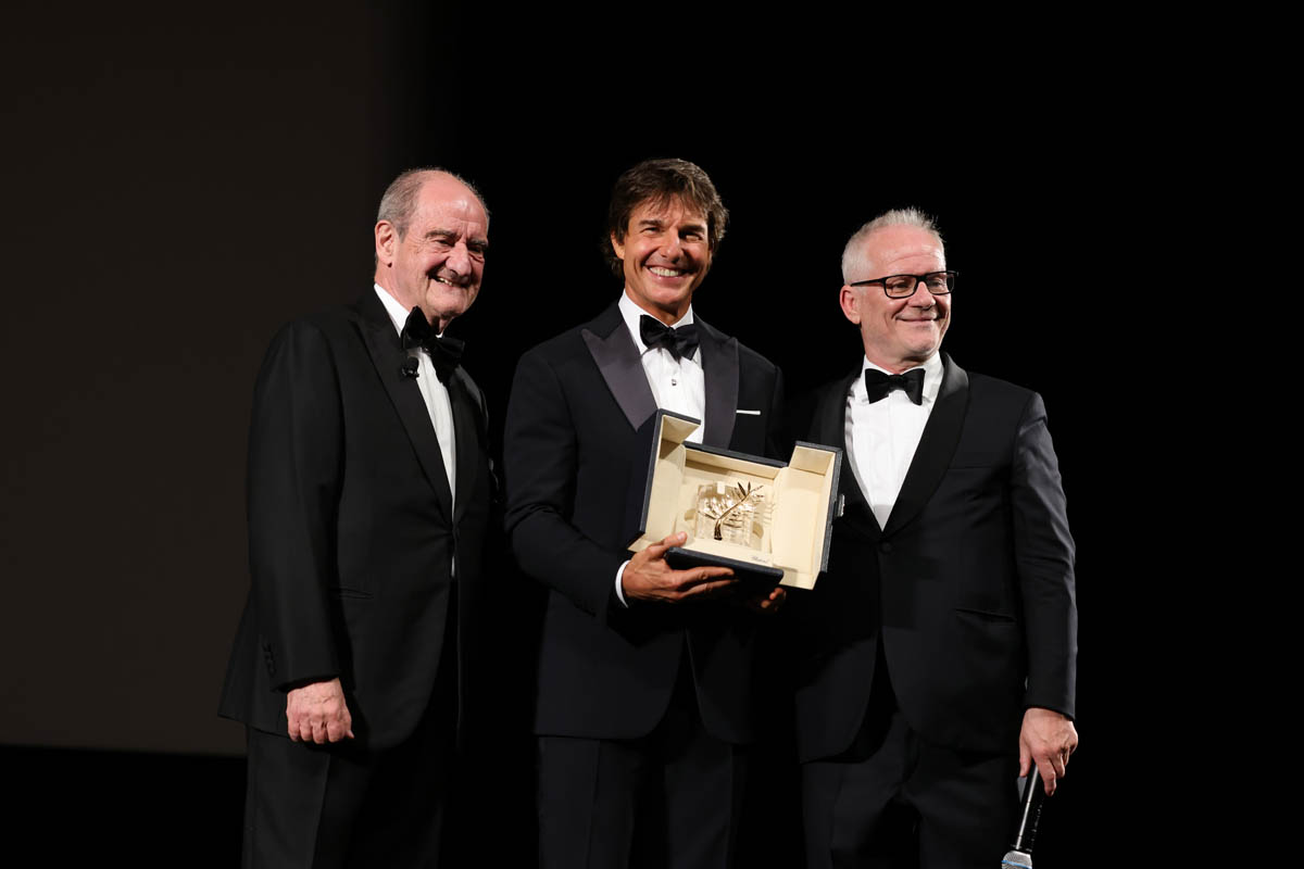 Sarah posted photos from the Top Gun gala spectacle in Cannes yesterday along with details from his Q&A before the premiere at the palais. I’m here to follow up on a few more details now that the movie has screened for the festival audience – to a five minute standing ovation, multiple ovations actually, because Tom was also presented with a “surprise” honorary Palme d’Or.