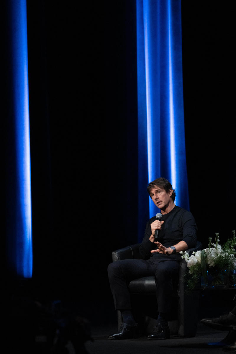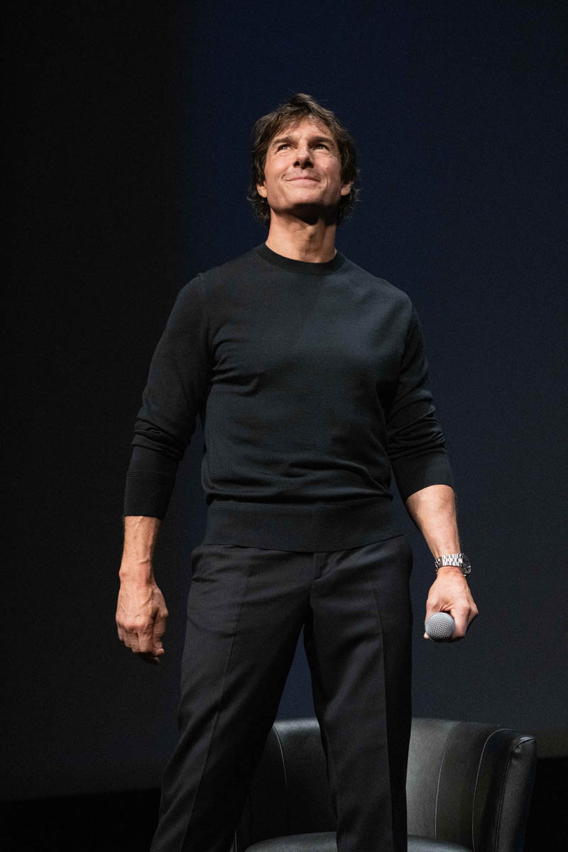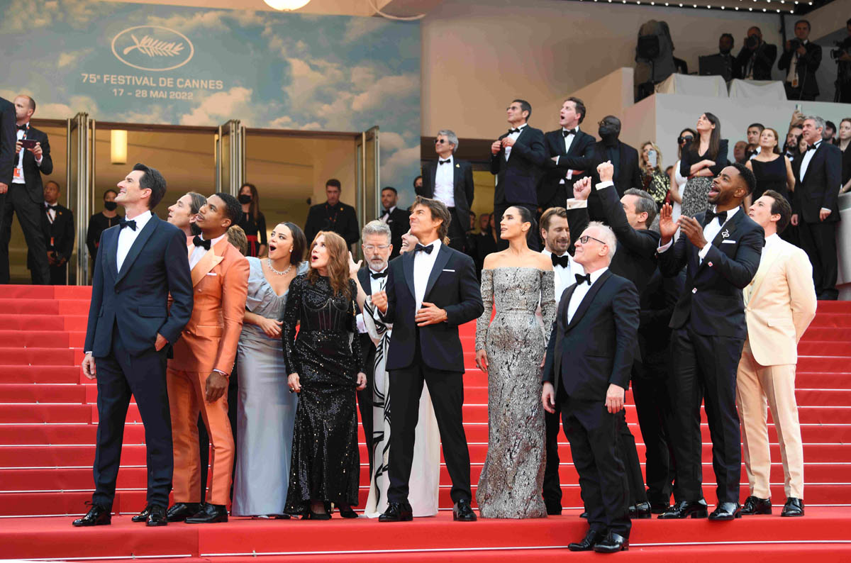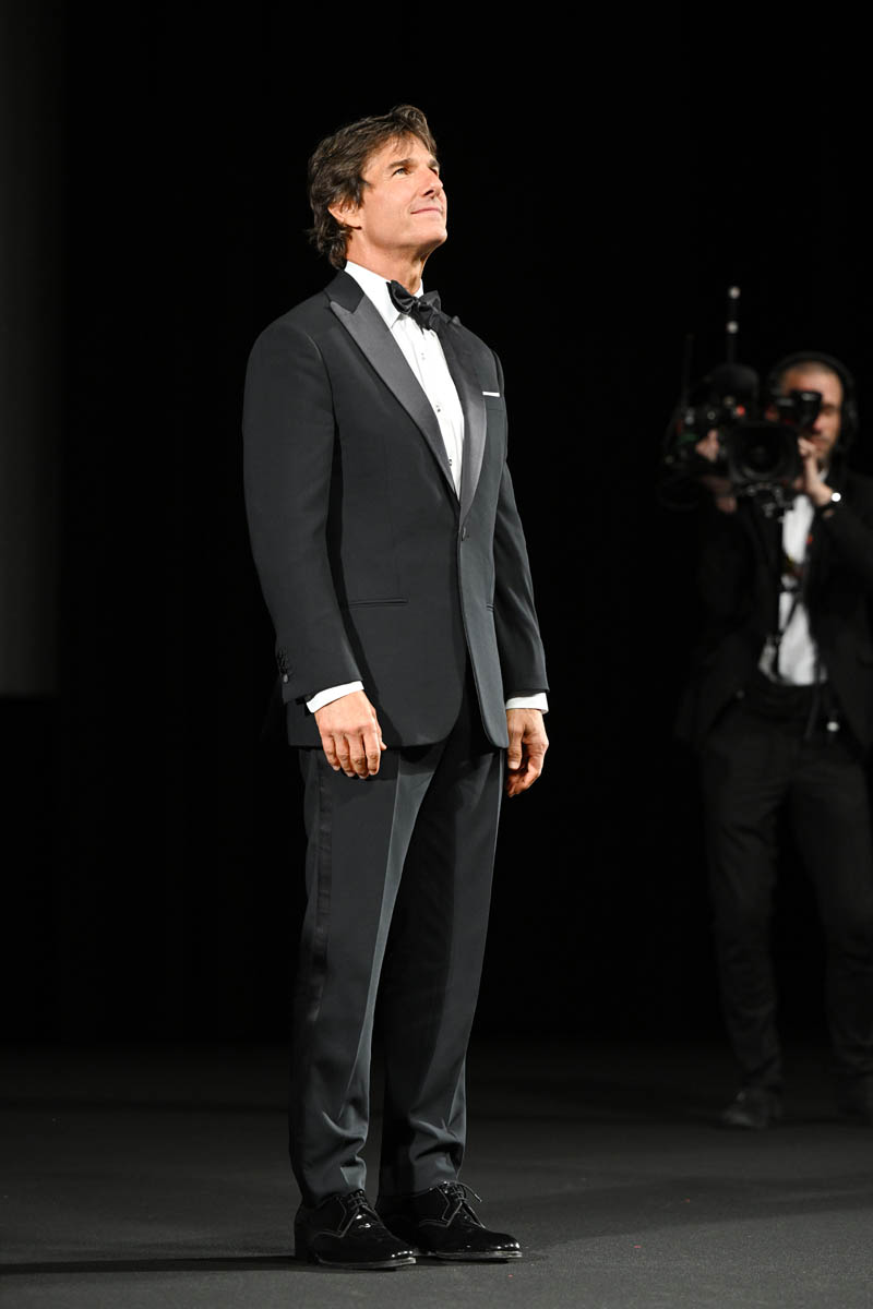 Sarah posted photos from the Top Gun gala spectacle in Cannes yesterday along with details from his Q&A before the premiere at the palais. I’m here to follow up on a few more details now that the movie has screened for the festival audience – to a five minute standing ovation, multiple ovations actually, because Tom was also presented with a “surprise” honorary Palme d’Or.
