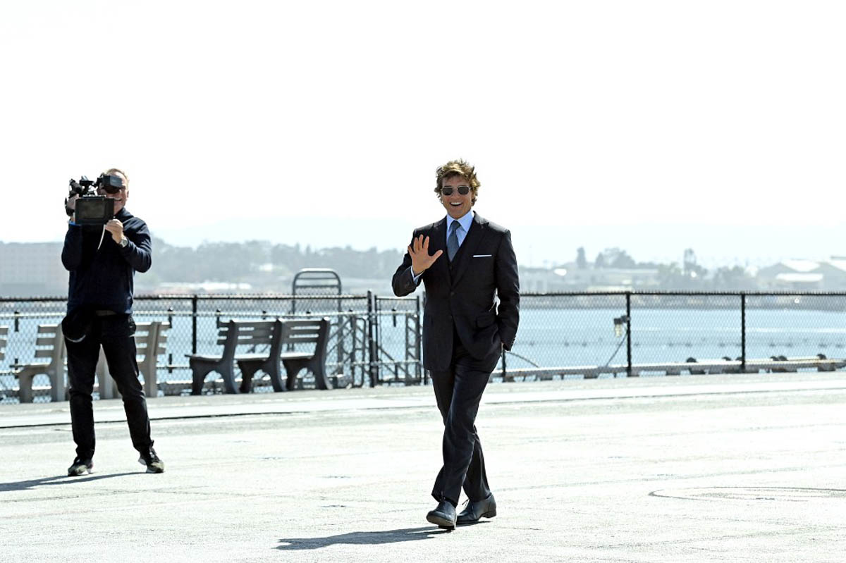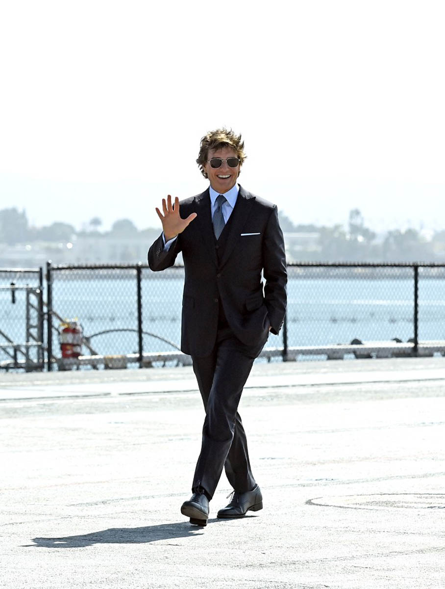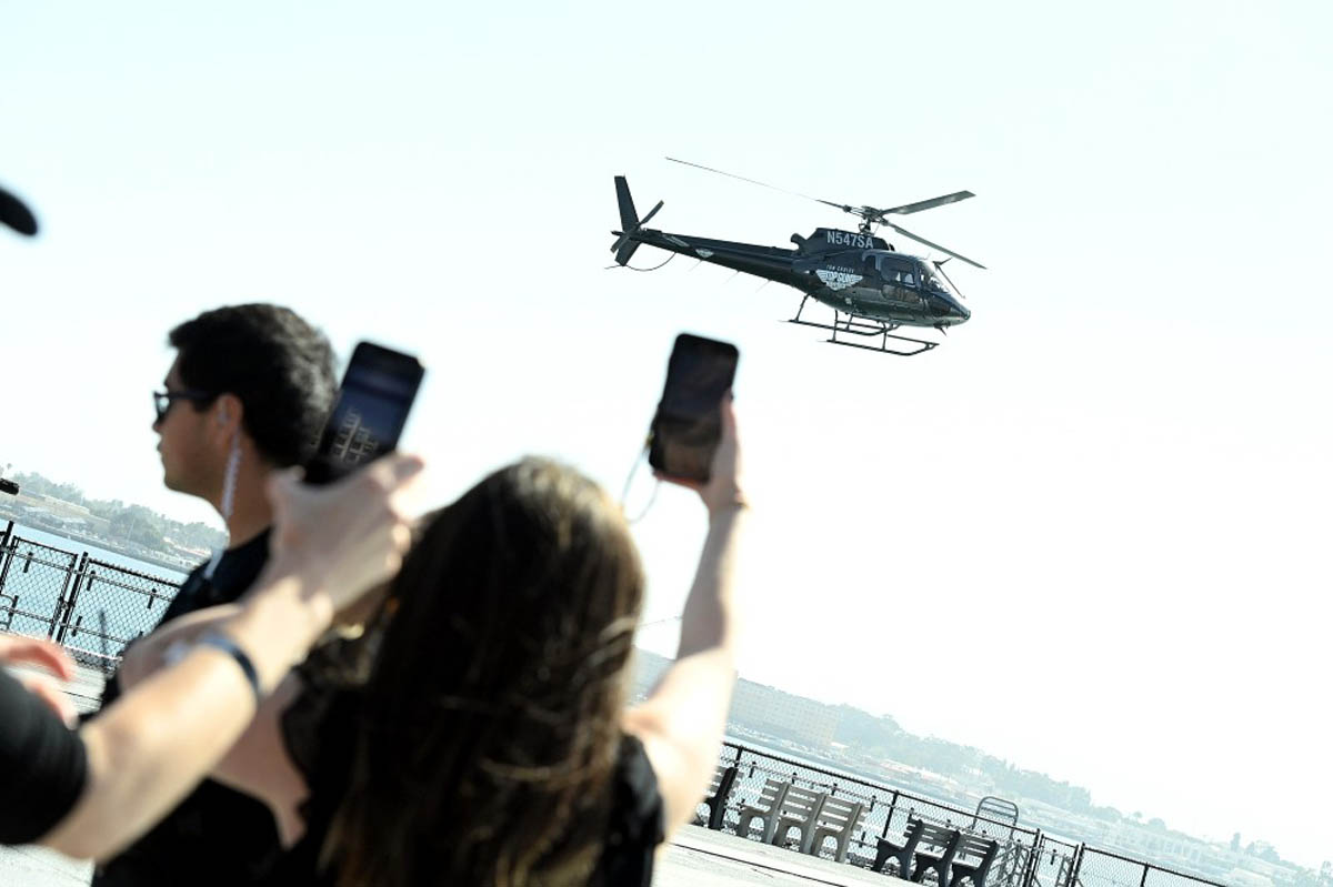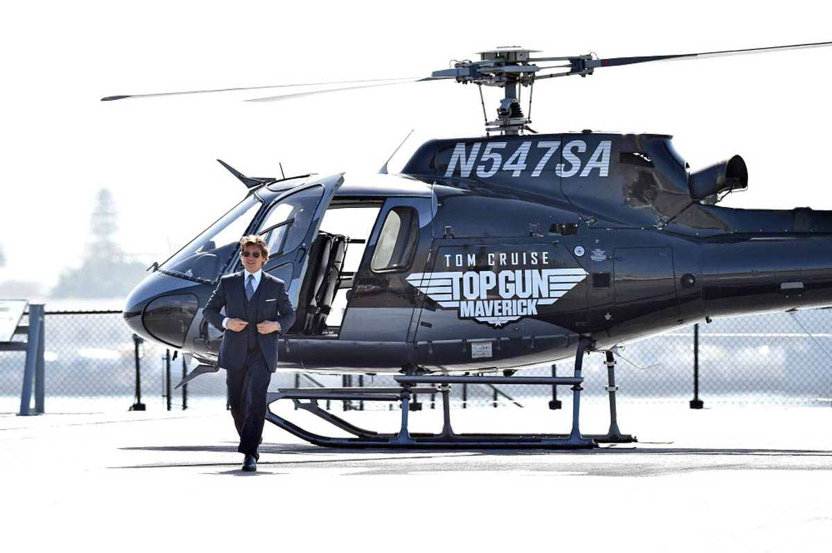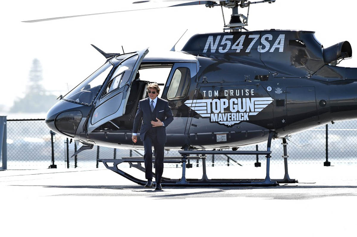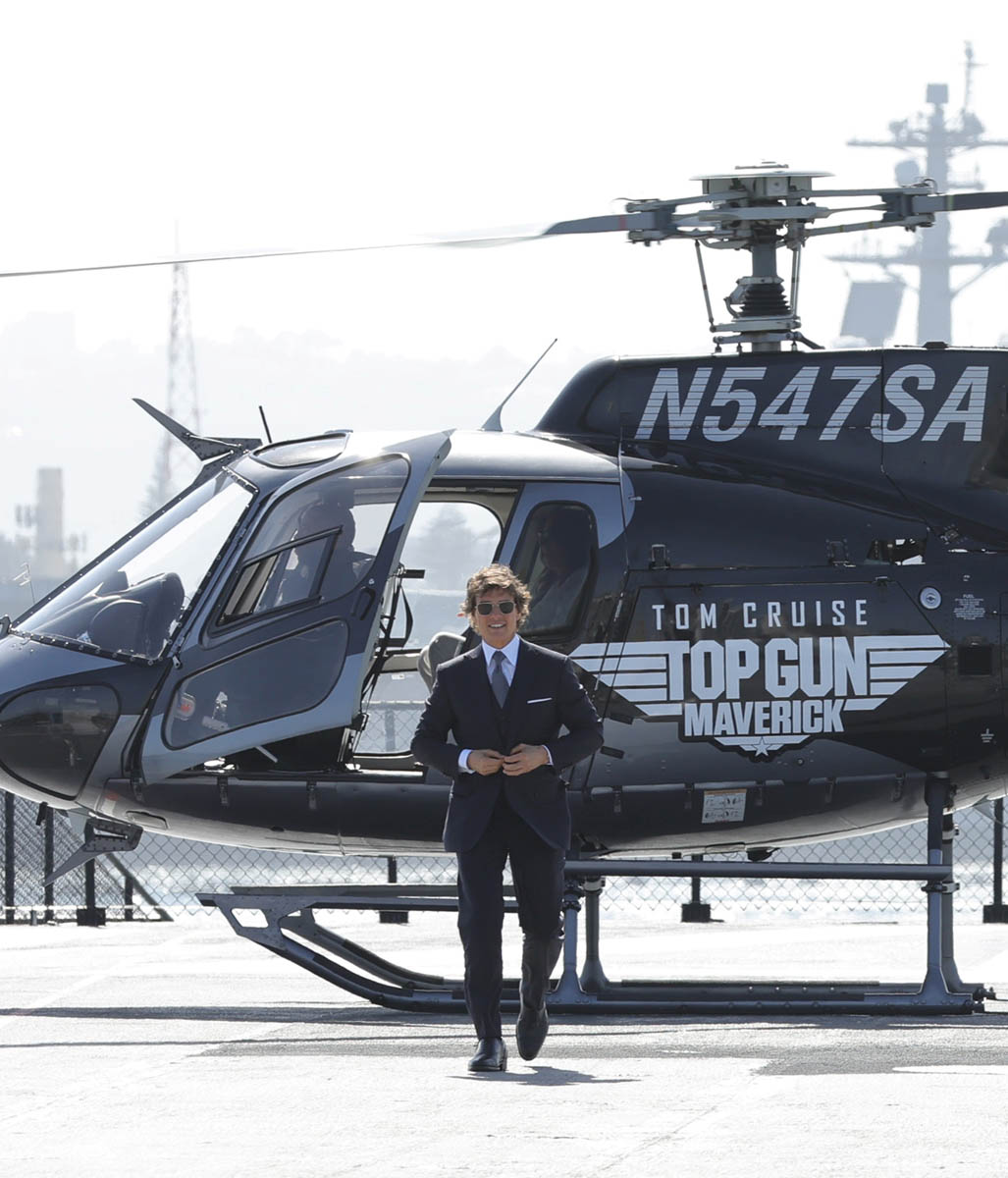 Remember last year when James Corden told that story about Tom Cruise texting him because he’s always looking for places to land his helicopter?! Tom Cruise and his chopper have become inseparable in the culture. This is his preferred method of travel. And that’s how he arrived at the Top Gun: Maverick premiere in San Diego yesterday.