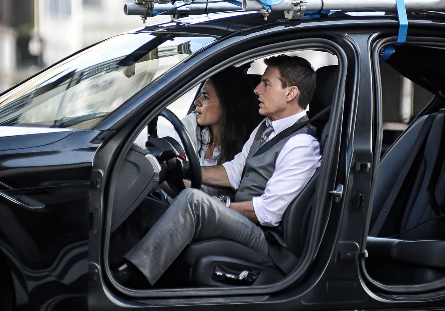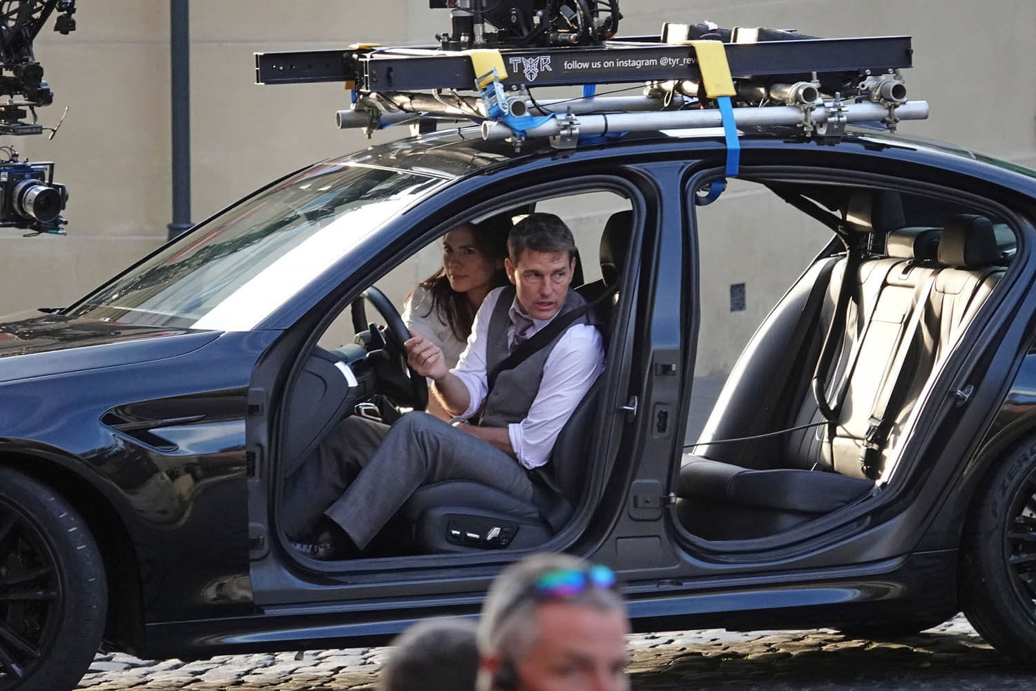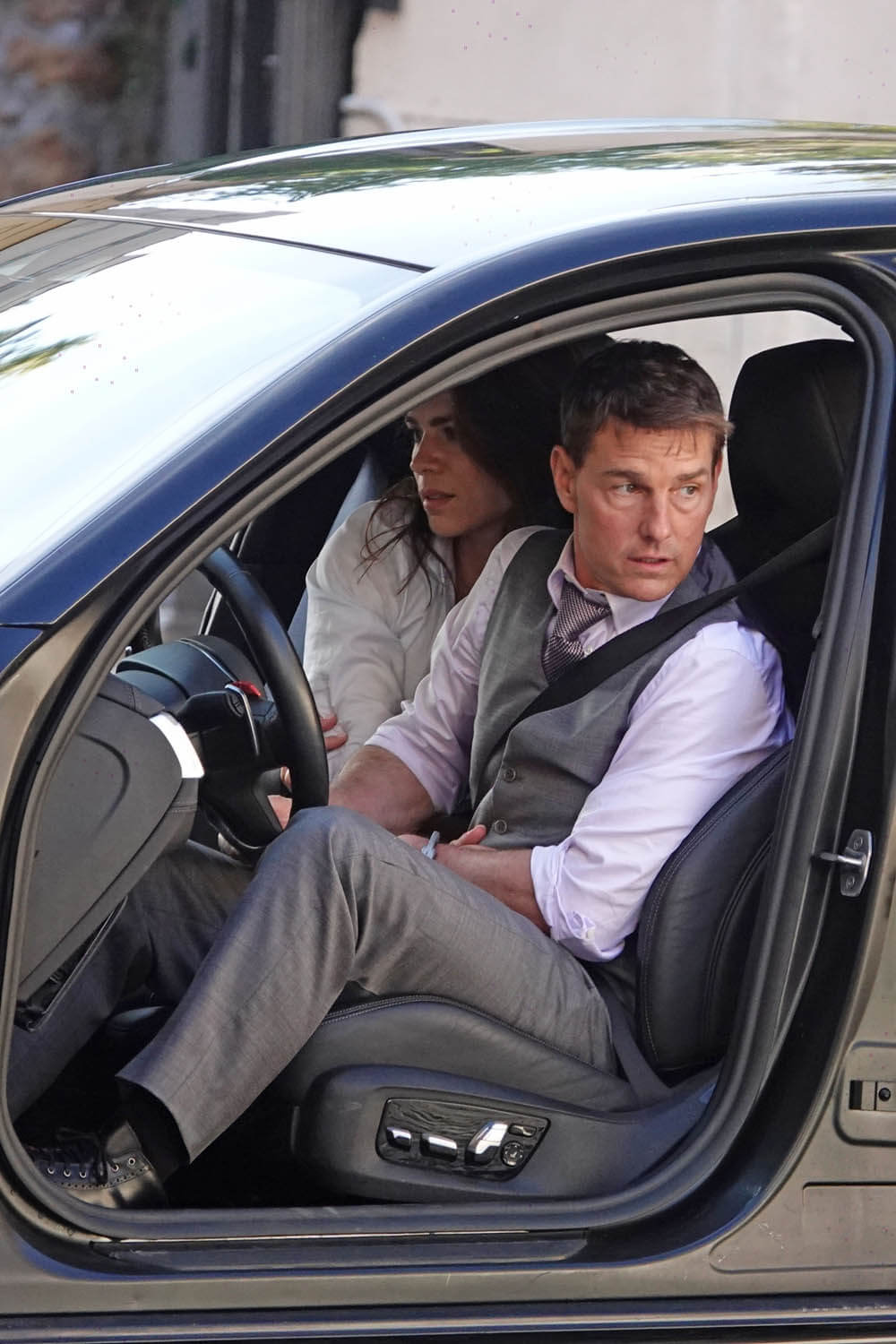 After shooting on a train the other day in Norway, Mission: Impossible 7 production has moved to Italy and here are Tom Cruise and Hayley Atwell shooting a car chase scene – what kind of other scene would it be involving a vehicle where Tom Cruise is concerned? It’s never going to be an easy breeze of a ride! – where they’re handcuffed together.