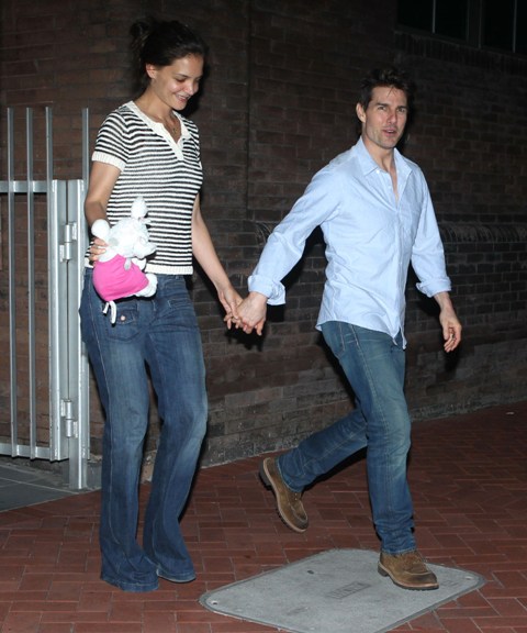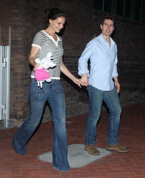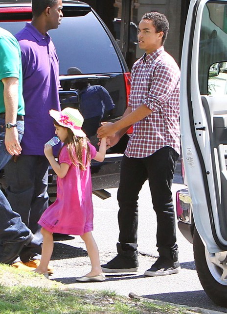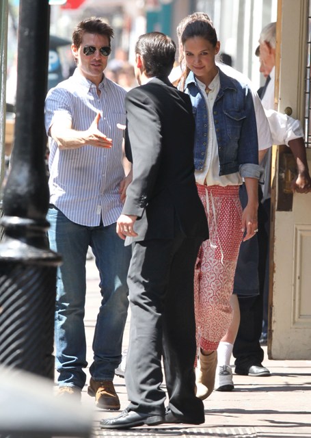 Anyway, it’s been a while since Tom has allowed photos. Which is probably why several of last week’s tabloids starting blaring headlines about their imminent split again. So why not a few pictures to throw them off on Easter weekend? Here they are, Tom, Katie, Little Sci, Connor Cruise, and several members of their families (I’ve not included those shots but her parents were there too) out in Baton Rouge, Louisiana where Tom has been shooting a new movie. He looks really, really good, right? Like younger than ever.