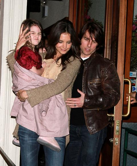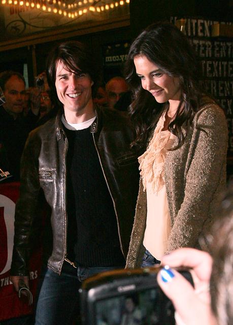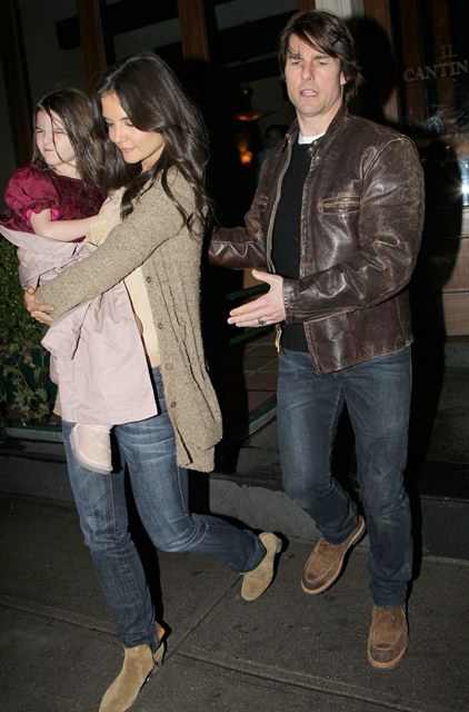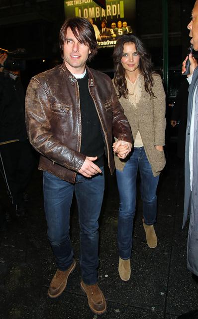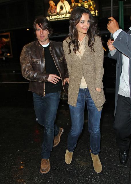 Here are Tom Cruise and Katie Holmes in New York last night with matching-ish footwear, heading to see American Idiot on Broadway before picking up Little Sci for dinner. Katie’s been in NYC promoting The Kennedys and Tom is taking the opportunity to continue preparing for his upcoming role in the big screen adaptation of Rock of Ages. This could also explain why Jon Bon Jovi (not pictured) was at the restaurant too. Don’t lie. You can’t wait to see Tom singing Wanted Dead Or Alive.